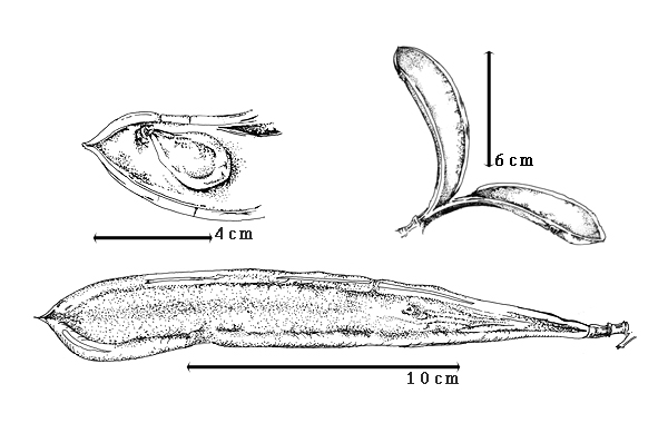 Fruit: A legume; unilocular; (5–)7–30 cm long; 1.2–4 cm wide; 1.5–2 cm thick; 2–9 times longer than wide; with deciduous androecial sheath; with deciduous corolla; with deciduous calyx; without orifice formed by curving of fruit or fruit segments; straight; not plicate; not twisted; symmetrical; linear, or oblanceolate; not inflated; compressed; without beak; long tapered at apex; aligned with longitudinal axis of fruit; long tapered at base; aligned with longitudinal axis of fruit; with the apex and base uniform in texture; ligneous; seed chambers externally invisible, or visible; margin not constricted; margin with sulcus; margin plain; wing(s) absent; substipitate; with the stipe 7–8 mm long; with all layers dehiscing; splitting along suture(s). Dehiscence of valves along both sutures; apical and down and basal and up; active; with valves revolute. Replum invisible. Epicarp dull; monochrome; brown (dark to reddish); with surface texture uniform; glabrate to pubescent and indurate; with hairs erect; with simple hairs; eglandular; without spines; not smooth; with elevated features; not veined; not tuberculate; faintly longitudinally striate; not exfoliating; without cracks; without embedded tissue, much thicker than epicarp, running from base to apex. Mesocarp present; surface not veined; 1-layered; without balsamic vesicles; without fibers; without reniform canals; solid; ligneous. Endocarp present; visible; dull; opaque; monochrome; brown (dark); without adhering pieces of testa; nonseptate; not exfoliating; remaining fused to mesocarp and epicarp; entire. Seed(s) 1–3; length parallel with fruit length; neither overlapping nor touching; in 1 series. Funiculus 2 mm long; of 1 length only; thick; triangular. Aril absent.
