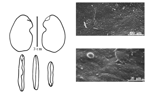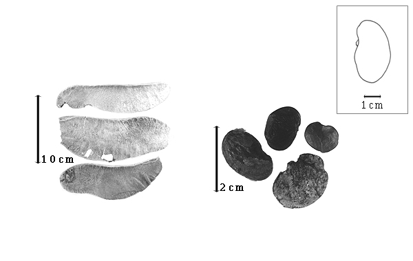 Seed: 24–38 mm long; 19–27 mm wide; 5–6 mm thick; not overgrown; not angular; asymmetrical; irregularly reniform; flattened; with surface wrinkled; without visible radicle and cotyledon lobes; without hilar sinus; without umbo on seed faces; without medial ridge on each face. Cuticle not exfoliating; not inflated; not wrinkled. Testa present; without pieces of adhering epicarp; not adhering to endocarp; free from endocarp; dull; not modified by a bloom; colored; mottled; with frequent mottles; reddish brown; with brown overlay (dark); glabrous; not smooth; with elevated features; wrinkled, or wrinkled and warty; chartaceous. Pleurogram absent. Pseudopleurogram absent. Fracture lines absent. Rim absent. Wing(s) absent. Raphe visible; from hilum to near base of seed and terminating; not bifurcating; color of testa; raised. Hilum present; visible; with faboid split; with the lips of the faboid split the same color as the rest of the hilum; larger than punctiform; 1.5–2.5 mm long; with curved outline; elliptic; marginal according to radicle tip; recessed; within halo; halo darker than testa. Lens not discernible. Endosperm absent. Cotyledons not smooth; wrinkled; both outer faces convex; both the same thickness; both more or less of equal length; not folded; margin entire 180 degrees from base of radicle; similar at apex; partially concealing radicle; notched at radicle; without lobes; with the interface division terminating at base of radicle; without margins recessed; yellow; inner face flat; glabrous on inner face. Embryonic axis right angled, or oblique; perpendicular to length of seed, or oblique to length of seed; without a joint evident between the radicle and the cotyledons. Radicle differentiated from cotyledon; linear; lobe tip straight; deflexed and parallel to cotyledon width, or oblique to cotyledons; centered between cotyledons; less than 1/2 length of cotyledons. Plumule rudimentary; glabrous.
