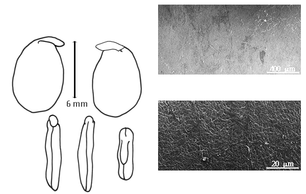 Seed: 5–9.5 mm long; 3–7 mm wide; 2–4 mm thick; not overgrown; not angular; symmetrical; elliptic to ovate to circular (sub), or D-shaped; compressed; with surface smooth; without visible radicle and cotyledon lobes; without hilar sinus; without umbo on seed faces; without medial ridge on each face. Cuticle not exfoliating; not inflated; not wrinkled. Testa present; without pieces of adhering epicarp; not adhering to endocarp; free from endocarp; glossy to dull; not modified by a bloom; colored; monochrome; red to brown (also to reddish brown); glabrous; smooth; chartaceous. Pleurogram absent. Pseudopleurogram absent. Fracture lines absent. Rim absent. Wing(s) absent. Raphe not visible. Hilum present; partially concealed; concealed by aril; with faboid split; with the lips of the faboid split the same color as the rest of the hilum; larger than punctiform; 0.6–1.5 mm long; with curved outline; elliptic; subapical to radicle tip; recessed; within rim; rim color darker than testa. Lens discernible; 1.2–1.5 mm long; with margins straight; linear; not in groove of raphe; adjacent to hilum; 0.5 mm from hilum; flush; similar color as testa; darker than testa; brown, or red (dark); not within corona, halo, or rim. Endosperm present; thin; not pluglike and not resembling tip of radicle; covering at least 1/2 of embryo, but not entire embryo; adnate to testa. Cotyledons smooth; both outer faces convex; both the same thickness; both more or less of equal length; not folded; margin entire 180 degrees from base of radicle; similar at apex; partially concealing radicle; split over radicle; with lobes; with lobes touching (auriculate); without basal groin formed by lobes; with the interface division terminating at base of radicle; without margins recessed; pale tan; inner face flat, or with central ridge on 1 and central groove on other; glabrous on inner face. Embryonic axis oblique; perpendicular to length of seed; without a joint evident between the radicle and the cotyledons. Radicle differentiated from cotyledon; linear; lobe tip curved; oblique to cotyledons; centered between cotyledons; less than 1/2 length of cotyledons. Plumule rudimentary; glabrous.