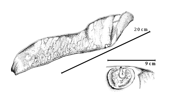 Fruit: A legume; unilocular; 9–59 cm long; 3.5–8 cm wide; 0.5–2 cm thick; 2–9 times longer than wide; with deciduous androecial sheath; with deciduous corolla; with deciduous calyx; without orifice formed by curving of fruit or fruit segments; curved; not plicate; not twisted; symmetrical, or asymmetrical; oblong, or falcate; with both sutures parallelly curved; not inflated; flattened; without beak; long tapered at apex to tapered at apex; aligned with longitudinal axis of fruit; short tapered at base; aligned with longitudinal axis of fruit; with the apex and base uniform in texture; ligneous; seed chambers externally invisible; margin not constricted; margin without sulcus; margin plain; wing(s) absent; substipitate; with all layers dehiscing; splitting along suture(s). Dehiscence of valves along both sutures; active (?); with valves twisting (?). Replum invisible. Epicarp glossy; monochrome; brown (dark); with surface texture uniform; glabrous; eglandular; without spines; smooth, or not smooth; with elevated features; veined; transversely veined relative to fruit length; not tuberculate; not exfoliating; without cracks; without embedded tissue, much thicker than epicarp, running from base to apex. Mesocarp present; surface not veined; 1-layered (?); without balsamic vesicles; oblique with fibers; without reniform canals; solid; ligneous. Endocarp present; visible; dull; opaque; monochrome; brown (dark reddish); without adhering pieces of testa; nonseptate; not exfoliating; remaining fused to mesocarp and epicarp; entire. Seed(s) at least 4; length parallel with fruit length and transverse to fruit length; neither overlapping nor touching; in 1 series. Funiculus 1.5 mm long; of 1 length only; thick; straight to curved. Aril absent.