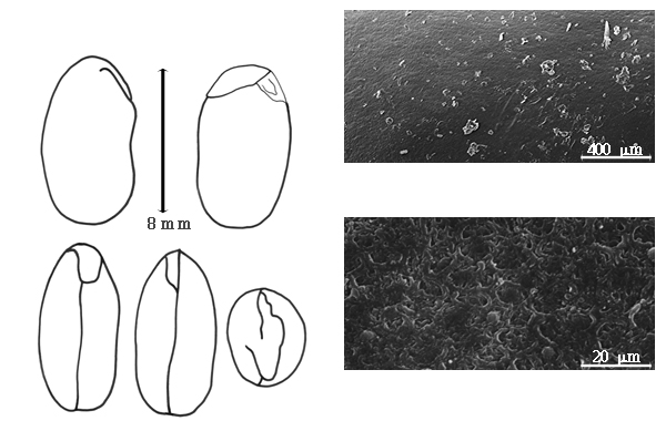 Seed: (4.5–)8–9.6 mm long; 5.5–7.2 mm wide; 2.3–6 mm thick; not overgrown; not angular; symmetrical; elliptic, or ovate; terete, or compressed; with surface smooth; without visible radicle and cotyledon lobes; without hilar sinus; without umbo on seed faces; without medial ridge on each face. Cuticle not exfoliating; not inflated; not wrinkled. Testa present; without pieces of adhering epicarp; not adhering to endocarp; free from endocarp; dull; not modified by a bloom; colored; monochrome; brown; glabrous; smooth; coriaceous. Pleurogram absent. Pseudopleurogram absent. Fracture lines absent. Rim absent. Wing(s) absent. Raphe not visible. Hilum present; visible; with faboid split; with the lips of the faboid split the same color as the rest of the hilum; larger than punctiform; 1.5–2.8 mm long; with curved outline; oval; subapical to radicle tip, or marginal according to radicle tip; recessed; within rim and within halo; halo lighter than testa; rim color darker than testa. Lens discernible; 0.1–0.8(–2) mm long; with margins straight; linear; not in groove of raphe; confluent with hilum; flush; dissimilar color from testa; darker than testa; dark brown; not within corona, halo, or rim. Endosperm present; thin, or trace; not pluglike and not resembling tip of radicle; restricted to region of embryo, or covering at least 1/2 of embryo, but not entire embryo; adnate to testa. Cotyledons smooth; both outer faces convex; both the same thickness; both more or less of equal length; not folded; margin entire 180 degrees from base of radicle; similar at apex; partially concealing radicle; entire over radicle; without lobes; with the interface division terminating at base of radicle; without margins recessed; tan; inner face flat; glabrous on inner face. Embryonic axis oblique to right angled; oblique to length of seed to perpendicular to length of seed; without a joint evident between the radicle and the cotyledons. Radicle differentiated from cotyledon; linear; lobe tip straight; oblique to cotyledons; centered between cotyledons; less than 1/2 length of cotyledons. Plumule rudimentary; glabrous.