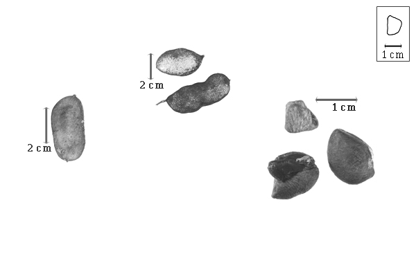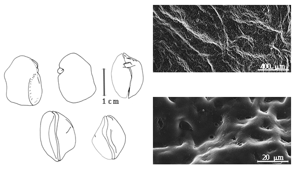 Seed: 10–18 mm long; 9–12 mm wide; 6–10 mm thick; not overgrown; angular; asymmetrical; irregular, or rectangular, or triangular; quadrangular, or compressed; with surface smooth; without visible radicle and cotyledon lobes; without hilar sinus; with umbo on seed faces; without medial ridge on each face. Cuticle not exfoliating; not inflated; not wrinkled. Testa present; without pieces of adhering epicarp; not adhering to endocarp; free from endocarp; dull; not modified by a bloom; colored; monochrome, or streaked; with frequent streaks; dark reddish brown; with brown overlay (lighter reddish); glabrous; not smooth; with elevated features; reticulate (radiating from hilum); chartaceous. Pleurogram absent. Pseudopleurogram absent. Fracture lines absent. Rim absent. Wing(s) absent. Raphe not visible. Hilum present; fully concealed, or visible; concealed by aril; without faboid split; larger than punctiform; 3–5 mm long; with straight outline; oblong; marginal according to radicle tip, or subapical to radicle tip; flush; within halo; halo darker than testa (black). Lens not discernible. Endosperm absent. Cotyledons not smooth; wrinkled; both outer faces convex; both the same thickness; both more or less of equal length; not folded; margin entire 180 degrees from base of radicle; similar at apex; partially concealing radicle; entire over radicle; without lobes; with the interface division terminating at base of radicle; without margins recessed; reddish brown; inner face flat; glabrous on inner face. Embryonic axis deflexed; oblique to length of seed; without a joint evident between the radicle and the cotyledons. Radicle differentiated from cotyledon; triangular; deflexed and parallel to cotyledon width; centered between cotyledons; less than 1/2 length of cotyledons (much less). Plumule rudimentary; glabrous.