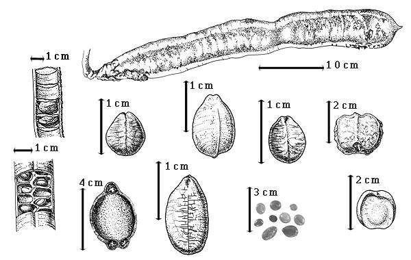 Fruit: A legume; unilocular; 20–75(–90) cm long; 1–5.5 cm wide; 1.5–3.5 cm thick; more than 9 times longer than wide; with deciduous androecial sheath; with deciduous corolla; with deciduous calyx; without orifice formed by curving of fruit or fruit segments; straight; not plicate; not twisted; asymmetrical; quadrangular, or linear; not inflated; compressed, or subtriangular, or terete; without beak; long tapered at apex to tapered at apex; aligned with longitudinal axis of fruit; tapered at base to rounded at base; aligned with longitudinal axis of fruit; with the apex and base uniform in texture; ligneous, or coriaceous; seed chambers externally invisible, or visible; margin usually not constricted; margin with sulcus (? stated as "keeled" or "doubly keeled"); margin embellished; margin with thickened sutural areas; wing(s) absent; substipitate to nonstipitate; indehiscent. Replum invisible. Epicarp dull; monochrome; reddish to blackish brown, or black; with surface texture uniform; glabrous; eglandular; without spines; smooth, or not smooth; with elevated features; veined, or not veined; reticulately veined; not tuberculate; exfoliating; with cracks; cracking transverse to fruit length; without embedded tissue, much thicker than epicarp, running from base to apex. Mesocarp present; surface not veined; 2-layered (?); without balsamic vesicles; with fibers; without reniform canals; with fibers over solid layer (stated as "pulpy and malodorous when fresh or fiberous pithy and solid when dry); ligneous to coriaceous. Endocarp present; visible; dull; opaque; monochrome; brown, or black; without adhering pieces of testa; septate (separating from rest of fruit as 1-seeded segments, or as 2 ranks of 1-seeded locules (longitudinally septate)); not exfoliating; remaining fused to mesocarp and epicarp; entire. Seed(s) 1–75; length oblique to fruit length, or transverse to fruit length (in C. hintoni); neither overlapping nor touching; in 1 series, or 2 or more series. Funiculus 0.1–4 mm long; of 1 length only; filiform; plicate and straight (for 2/3 length). Aril absent.