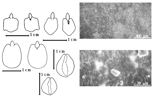 Cotyledon, embryo, and testa: C. fastuosa C.L. von Willdenow ex J.R.T. Vogel - center embryo in situ in endosperm; C. fistula C. Linnaeus - left center cotyledons cordate and partially investing radicle (L) and embryonic axis (R), testa SEMs; C. javanica C. Linnaeus - bottom left embryo in situ in endosperm, top left center cotyledons cordate and partially investing radicle (L) and embryonic axis (R); C. moschata K.S. Kunth - top far left cotyledons cordate and partially investing radicle (L) and embryonic axis (R).