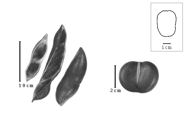 Fruit: A legume; unilocular; 13–22 cm long; 3.5–5.5 cm wide; 2.6–5 cm thick; 2–9 times longer than wide; with deciduous androecial sheath; with deciduous corolla; with deciduous calyx; without orifice formed by curving of fruit or fruit segments; straight; not plicate; not twisted; symmetrical, or asymmetrical (slightly); fusiform, or falcate (slightly); with both sutures nearly straight; not inflated; terete; without beak; short tapered at apex; aligned with longitudinal axis of fruit, or oblique with longitudinal axis of fruit (slightly); tapered at base; aligned with longitudinal axis of fruit; with the apex and base uniform in texture; ligneous; seed chambers externally invisible; margin not constricted; margin without sulcus; margin plain; wing(s) absent; stipitate; with the stipe 5–10 mm long; with all layers dehiscing; splitting along suture(s). Dehiscence of valves along both sutures; apical and down; active; with valves twisting. Replum invisible. Epicarp dull; multicolored; mottled; brown; with black overlay, or brown overlay; mottling color combination variable; with surface texture uniform; glabrous; eglandular; without spines; not smooth; with elevated features; not veined; not tuberculate; papillose; not exfoliating; without cracks, or with cracks; cracking transverse to fruit length; without embedded tissue, much thicker than epicarp, running from base to apex. Mesocarp present; thick; surface not veined; 2-layered; without balsamic vesicles; without fibers; without reniform canals; with solid layer over solid layer; ligneous. Endocarp present; visible; dull; opaque; mottled; brown; with mottling more or less uniform (dark); with brown overlay; smooth; without adhering pieces of testa; septate; with septa thin (tissue paper-like), flexible to thicker than paper, firm; with septa eglandular; chartaceous; not exfoliating; remaining fused to mesocarp and epicarp; without wings; entire. Seed(s) 2–6; length parallel with fruit length, or oblique to fruit length; neither overlapping nor touching; in 1 series. Funiculus ca. 3 mm long; of 1 length only; flattened; triangular. Aril present; dry; when dry rim-aril; entire; without tongue (or flap) on lips of 2-lipped rim-aril; cream.