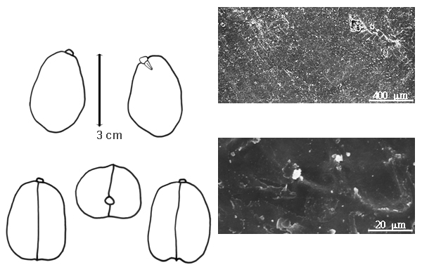Seed: 35–39 mm long; 34–36 mm wide; 20–25 mm thick; not overgrown; not angular; symmetrical; bilobed, cicerlike, or circular (nearly); mounded on 1 side and straight on other side; with surface smooth; without visible radicle and cotyledon lobes; without hilar sinus; without umbo on seed faces; without medial ridge on each face. Cuticle not exfoliating; not inflated; not wrinkled. Testa present; without pieces of adhering epicarp; not adhering to endocarp; free from endocarp; dull; not modified by a bloom; colored; monochrome; brown; glabrous; smooth; chartaceous. Pleurogram absent. Pseudopleurogram absent. Fracture lines absent. Rim absent. Wing(s) absent. Raphe not visible. Hilum present; partially concealed; concealed by aril; with faboid split; with the lips of the faboid split lighter colored than the rest of the hilum and therefore conspicuous; larger than punctiform; 38–40 mm long; with straight outline; linear; apical at apex of radicle tip; flush; within halo; halo darker than testa. Lens discernible; 2.2 mm long; with margins curved; elliptic; not in groove of raphe; confluent with hilum; flush; similar color as testa; lighter than testa; within corona; corona color darker than testa. Endosperm absent. Cotyledons not smooth; wrinkled; both outer faces convex; both the same thickness; both more or less of equal length; not folded; margin entire 180 degrees from base of radicle, or not entire 180 degrees from base of radicle; notched; similar at apex; not concealing radicle; notched at radicle; without lobes; with the interface division terminating at base of radicle; with margin(s) recessed; with 1 margin recessed, or both margins recessed; recessed on same side as hilum (terminal radicle); brown; inner face flat, or concave; glabrous on inner face. Embryonic axis straight; parallel to length of seed; without a joint evident between the radicle and the cotyledons. Radicle differentiated from cotyledon; bulbose; lobe tip straight; straight with embryonic axis; centered between cotyledons; less than 1/2 length of cotyledons. Plumule well developed; glabrous.