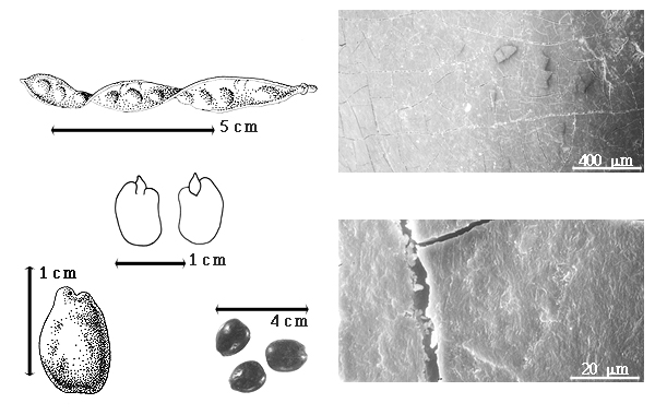 Fruit: A legume; unilocular; 5–20 cm long; 1–2.5 cm wide; 0.7–1.2 cm thick; 2–9 times longer than wide; with deciduous androecial sheath; with deciduous corolla; with deciduous calyx; without orifice formed by curving of fruit or fruit segments; straight to curved; not plicate; asymmetrical; linear; not inflated; compressed; without beak; long tapered at apex to tapered at apex; aligned with longitudinal axis of fruit; long tapered at base to tapered at base; aligned with longitudinal axis of fruit; with the apex and base uniform in texture; ligneous; seed chambers externally visible, or invisible; margin constricted, or not constricted; margin constricted along both margins to slightly constricted along both margins, or constricted only on 1 margin to slightly constricted only on 1 margin; margin without sulcus; margin plain; wing(s) absent; stipitate; with the stipe 0.6–8 mm long; indehiscent. Replum invisible. Epicarp dull; monochrome; reddish or purple to black brown; with surface texture uniform; glabrous to pubescent and indurate; with hairs erect; with simple hairs; eglandular; without spines; not smooth; with elevated features; not veined; not tuberculate; rugose; not exfoliating; without cracks; without embedded tissue, much thicker than epicarp, running from base to apex. Mesocarp present; surface not veined; 1-layered; without balsamic vesicles; without fibers; without reniform canals; flesh when fresh or spongy, or solid; ligneous. Endocarp present; visible; dull; opaque; monochrome; tan; without adhering pieces of testa; septate; not exfoliating; remaining fused to mesocarp and epicarp; entire. Seed(s) 1–14; length transverse to fruit length; neither overlapping nor touching; in 1 series. Funiculus 0.1–3 mm long; of 1 length only; flattened; straight. Aril absent.