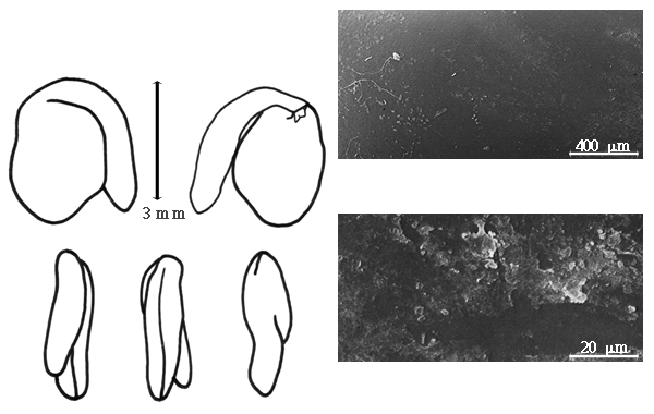 Seed: 2.7–5 mm long; 2.2–3.5 mm wide; 1.5–2.7 mm thick; not overgrown; angular, or not angular; asymmetrical; oblong, or ovate, or circular (more or less), or triangular (more or less), or cordate; compressed, or terete; with surface smooth; with visible radicle and cotyledon lobes, or without visible radicle and cotyledon lobes; without external groove between radicle and cotyledon lobes; without hilar sinus; with umbo on seed faces; without medial ridge on each face. Cuticle not exfoliating; not inflated; wrinkled. Testa present; without pieces of adhering epicarp; not adhering to endocarp; free from endocarp; glossy; not modified by a bloom; colored; monochrome; brown to reddish or greenish brown, or tan (to greenish tan), or olive, or black; glabrous; smooth; coriaceous. Pleurogram absent. Pseudopleurogram absent. Fracture lines absent. Rim absent. Wing(s) absent. Raphe not visible. Hilum present; partially concealed; concealed by aril; with faboid split; with the lips of the faboid split the same color as the rest of the hilum, or lighter colored than the rest of the hilum and therefore conspicuous; larger than punctiform; 0.3–1 mm long; with curved outline; circular, or elliptic; apical at apex of radicle tip, or subapical to radicle tip, or between cotyledon and radicle lobe; recessed; within rim, or within halo; halo of testa (to duller); rim color of testa. Lens discernible, or not discernible; 0.1–1 mm long; with margins straight, or curved; oblong; circular (with light colored line), or elliptic, or oblong; not in groove of raphe; confluent with hilum; mounded, or flush; same color as testa, or dissimilar color from testa; lighter than testa; reddish tan; not within corona, halo, or rim. Endosperm present; thick; not pluglike and not resembling tip of radicle; covering entire embryo; adnate to embryo. Cotyledons smooth; both outer faces convex; both the same thickness; both more or less of equal length; not folded; margin entire 180 degrees from base of radicle; similar at apex; not concealing radicle; split over radicle; with lobes; with the interface division terminating at base of radicle; without margins recessed; tan; inner face flat; glabrous on inner face. Embryonic axis deflexed; oblique to length of seed; without a joint evident between the radicle and the cotyledons. Radicle differentiated from cotyledon; linear, or bulbose; lobe tip straight; deflexed and parallel to cotyledon length; centered between cotyledons; equaling length of cotyledons, or exceeding length of cotyledons. Plumule rudimentary; glabrous.