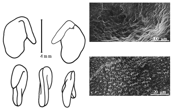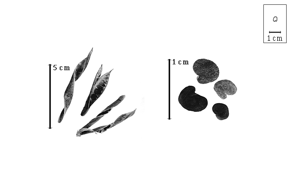 Seed: 2.5–6 mm long; 2–4 mm wide; 1–1.2 mm thick; not overgrown; not angular, or angular; asymmetrical; mitaform (and bent on faces), or reniform (and bent on faces), or irregular; compressed; with surface smooth; without visible radicle and cotyledon lobes; without hilar sinus; without umbo on seed faces; without medial ridge on each face. Cuticle not exfoliating; not inflated; not wrinkled. Testa present; without pieces of adhering epicarp; not adhering to endocarp; free from endocarp; dull; not modified by a bloom; colored; monochrome, or mottled and streaked; with frequent mottles; with frequent streaks; brown to reddish brown, or tan; with black overlay; glabrous; smooth, or not smooth; with elevated features, or recessed features; wrinkled, or warty, or shagreen, or reticulate; pitted with small separate pits, or large depressions on each face (2); chartaceous. Pleurogram absent. Pseudopleurogram absent. Fracture lines absent. Rim absent. Wing(s) absent. Raphe visible; from hilum to lens; not bifurcating; darker than testa; blackish brown, or black; flush. Hilum present; fully concealed; concealed by radicle lobe, or wing; with faboid split; with the lips of the faboid split the same color as the rest of the hilum; punctiform; between cotyledon and radicle lobe; flush; not within corona, halo, or rim. Lens barely discernible, or not discernible; with margins curved; more or less circular; not in groove of raphe; adjacent to hilum; 1.5 mm from hilum; flush; dissimilar color from testa; darker than testa; blackish brown; not within corona, halo, or rim. Endosperm present; thick; not pluglike and not resembling tip of radicle; covering entire embryo; adnate to testa. Cotyledons smooth; both outer faces convex; both the same thickness; both more or less of equal length; not folded; margin entire 180 degrees from base of radicle; similar at apex; partially concealing radicle; entire over radicle; without lobes; with the interface division terminating at base of radicle; without margins recessed; reddish brown; inner face flat; glabrous on inner face. Embryonic axis deflexed; oblique to length of seed; without a joint evident between the radicle and the cotyledons. Radicle differentiated from cotyledon; linear; lobe tip hooked; deflexed and parallel to cotyledon length; centered between cotyledons; less than 1/2 length of cotyledons, or 1/2 to nearly length of cotyledons. Plumule rudimentary; glabrous.
