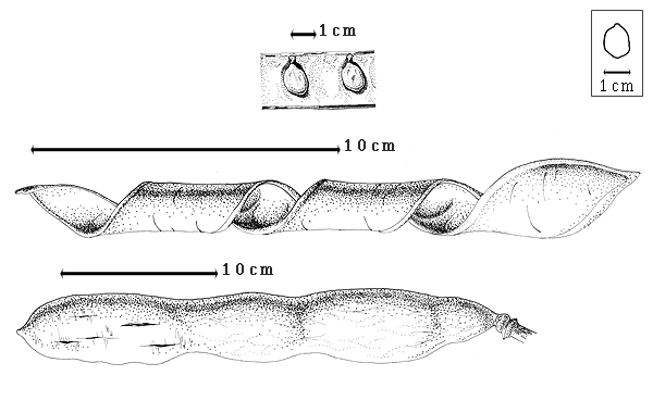 Fruit: A legume; unilocular; 30–46 cm long; 4.5–5.5 cm wide; 0.6–1.8 cm thick; 2–9 times longer than wide; with deciduous androecial sheath; with deciduous corolla; with deciduous calyx; without orifice formed by curving of fruit or fruit segments; straight; not plicate; not twisted; asymmetrical; oblong to linear; not inflated; compressed; without beak; long tapered at apex; aligned with longitudinal axis of fruit; tapered at base; aligned with longitudinal axis of fruit; with the apex and base uniform in texture; ligneous; seed chambers externally invisible; margin not constricted; margin without sulcus; margin plain; wing(s) absent; substipitate; with all layers dehiscing; splitting along suture(s). Dehiscence of valves along both sutures; active; with valves twisting. Replum invisible. Epicarp glossy, or dull (when older); monochrome; dark brown; with surface texture uniform; glabrous; eglandular; without spines; not smooth; with recessed features; veined; obliquely veined relative to fruit length; not tuberculate; not exfoliating; with cracks (minutely); cracking transverse to fruit length to oblique to fruit length; without embedded tissue, much thicker than epicarp, running from base to apex. Mesocarp present; surface not veined; 1-layered; without balsamic vesicles; without fibers; without reniform canals; solid; ligneous. Endocarp present; visible; dull; opaque; monochrome; tan; scurfy (between seeds), or smooth (when older); without adhering pieces of testa; subseptate; not exfoliating; remaining fused to mesocarp and epicarp; entire. Seed(s) 9–14; length transverse to fruit length; neither overlapping nor touching; in 1 series. Funiculus 0.1–4.5 mm long; of 1 length only; thick; straight. Aril absent.