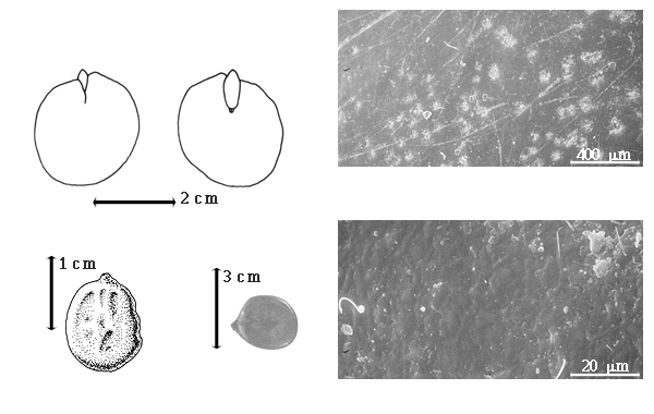 Seed: 23–27 mm long; 19–21 mm wide; 4–5 mm thick; not overgrown; not angular; symmetrical; circular (subcircular); compressed; with surface smooth; without visible radicle and cotyledon lobes; without hilar sinus; without umbo on seed faces; without medial ridge on each face. Cuticle not exfoliating; not inflated; not wrinkled. Testa present; without pieces of adhering epicarp; not adhering to endocarp; free from endocarp; glossy; not modified by a bloom; colored; monochrome; reddish brown; glabrous; not smooth; with recessed features; minutely pitted with small separate pits; coriaceous. Pleurogram absent. Pseudopleurogram absent. Fracture lines absent. Rim absent. Wing(s) absent. Raphe not visible. Hilum present; fully concealed; concealed by funicular remnant; without faboid split; larger than punctiform; 2–4 mm long; with straight outline; linear; apical at apex of radicle tip; flush; not within corona, halo, or rim. Lens discernible; 1 mm long; with margins straight; oblong; not in groove of raphe; recessed; dissimilar color from testa; tan; not within corona, halo, or rim. Endosperm absent. Cotyledons smooth; both outer faces convex; both the same thickness; both more or less of equal length; not folded; margin entire 180 degrees from base of radicle; similar at apex; partially concealing radicle; notched at radicle and split over radicle; with the interface division terminating at base of radicle; without margins recessed; inner face flat; glabrous on inner face. Embryonic axis straight; parallel to length of seed; without a joint evident between the radicle and the cotyledons. Radicle differentiated from cotyledon; centered between cotyledons. Plumule rudimentary; glabrous.