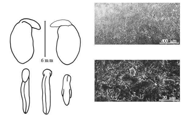 Seed: 5–10 mm long; 3–5 mm wide; 1.8–3 mm thick; not overgrown; not angular; asymmetrical; elliptic to irregular; compressed; with surface smooth; without visible radicle and cotyledon lobes; without hilar sinus; without umbo on seed faces; without medial ridge on each face. Cuticle not exfoliating; not inflated; not wrinkled. Testa present; without pieces of adhering epicarp; not adhering to endocarp; free from endocarp; dull; not modified by a bloom; colored; monochrome; brown to reddish brown; glabrous; smooth; chartaceous. Pleurogram absent. Pseudopleurogram absent. Fracture lines absent. Rim absent. Wing(s) absent. Raphe visible; from hilum through lens to base of seed and terminating; not bifurcating; darker than testa; brown; flush. Hilum present; visible; with faboid split; with the lips of the faboid split the same color as the rest of the hilum; larger than punctiform; 1–1.5 mm long; with curved outline; circular, or elliptic; apical according to radicle tip but marginal according to seed length; recessed; within corona; corona color darker than testa. Lens discernible; 1–1.5 mm long; with margins straight; diamond-shaped; not in groove of raphe; adjacent to hilum; 1–2 mm from hilum; mounded; similar color as testa; darker than testa; brown; not within corona, halo, or rim. Endosperm present; thick; not pluglike and not resembling tip of radicle; covering entire embryo; adnate to testa, or embryo. Cotyledons not smooth; sulcate; both outer faces convex; both the same thickness; both more or less of equal length; not folded; margin entire 180 degrees from base of radicle; similar at apex; partially concealing radicle, or not concealing radicle; entire over radicle; without lobes; with the interface division terminating at base of radicle; without margins recessed; tan; inner face flat; glabrous on inner face. Embryonic axis oblique; parallel to length of seed; without a joint evident between the radicle and the cotyledons. Radicle differentiated from cotyledon; linear; lobe tip straight, or curved; oblique to cotyledons; centered between cotyledons; less than 1/2 length of cotyledons. Plumule rudimentary; glabrous.