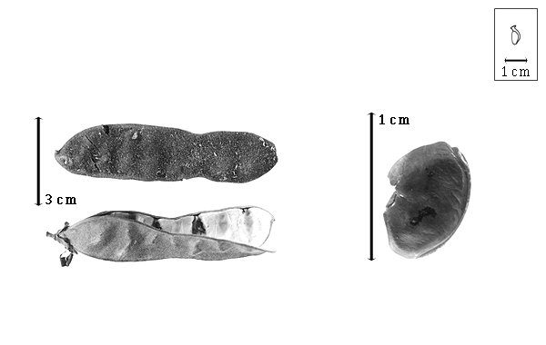 Seed: 8.4 mm long; 6 mm wide; 2.5 mm thick; not overgrown; not angular; symmetrical; ovate, or reniform (Maxwell, 1977Maxwell, 1977: