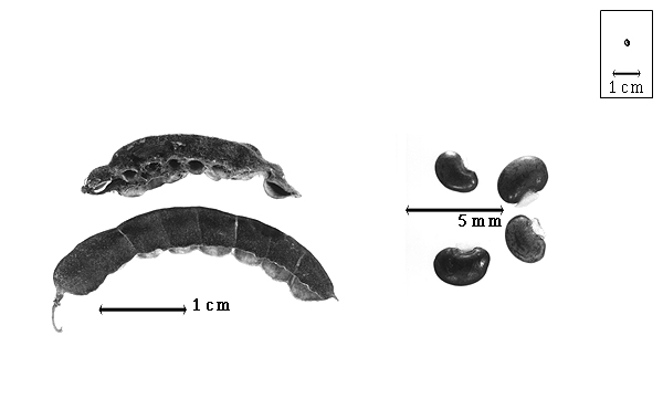 Fruit: A legume (resembling a loment); unilocular; 0.7–5 cm long; 0.3–0.7 cm wide; 0.18–0.2 cm thick; 2–9 times longer than wide; with deciduous androecial sheath, or persistent androecial sheath; with deciduous corolla; with persistent calyx; with calyx shorter than fruit; without orifice formed by curving of fruit or fruit segments; curved (or slightly curved); not plicate; not twisted; asymmetrical; linear (with toothed lower suture); with 1 straight and 1 curved suture, or both sutures nearly straight; narrowing in several places, resembling Desmodium (3.11.09) fruit (false loment); not inflated; flattened; without beak; rounded at apex; oblique with longitudinal axis of fruit, or aligned with longitudinal axis of fruit; short tapered at base, or rounded at base; oblique with longitudinal axis of fruit; with the apex and base uniform in texture; coriaceous; seed chambers externally visible; seed chambers with the raised seed chambers torulose; margin constricted; margin constricted only on 1 margin; margin without sulcus; margin plain; wing(s) absent; nonstipitate; with all layers dehiscing; splitting along suture(s) (lower). Dehiscence of valves along 1 suture (lower margin); passive. Replum invisible. Epicarp dull; monochrome; dark reddish brown; with surface texture uniform; pubescent and indurate; with hairs erect, or appressed; with 1 type of pubescence; pilose, or tomentose; with pubescence hook tipped golden and gray (plain tipped); with pubescence uniformly distributed; with simple hairs (shorter gray plain tipped, longer yellow hooked tipped); with hair bases plain; eglandular; without spines; smooth; not veined; not tuberculate; not exfoliating; without cracks; without embedded tissue, much thicker than epicarp, running from base to apex. Mesocarp present; thin; surface not veined; 1-layered; without balsamic vesicles; without fibers; without reniform canals; solid; coriaceous. Endocarp present; visible; dull, or glossy; opaque; monochrome; reddish tan, or brown (reddish); smooth; without adhering pieces of testa; septate; with septa thicker than paper, firm; with septa eglandular; chartaceous; not exfoliating; remaining fused to mesocarp and epicarp; without wings; entire. Seed(s) 1–13; length parallel with fruit length; neither overlapping nor touching; in 1 series. Funiculus of 1 length only; flattened, or triangular; straight. Aril present; fleshy; when fleshy cupshaped (with undulate margin); entire; covering less than 1/2 of seed; tan.