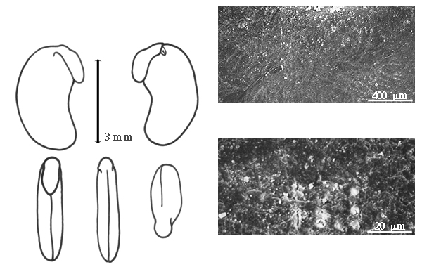 Seed: 2.5–4.5 mm long; 2.5–4 mm wide; 1.5–1.7 mm thick; not overgrown; not angular; asymmetrical; elliptic, or reniform; compressed; with surface smooth; without visible radicle and cotyledon lobes; without hilar sinus; with umbo on seed faces; without medial ridge on each face. Cuticle not exfoliating; not inflated; not wrinkled. Testa present; without pieces of adhering epicarp; not adhering to endocarp; free from endocarp; glossy, or dull; not modified by a bloom; colored; monochrome, or mottled and streaked; with frequent mottles; with frequent streaks; reddish brown; with black overlay; glabrous; smooth; coriaceous. Pleurogram absent. Pseudopleurogram absent. Fracture lines absent. Rim absent. Wing(s) absent. Raphe not visible. Hilum present; visible, or partially concealed; concealed by aril; with faboid split; with the lips of the faboid split the same color as the rest of the hilum; larger than punctiform; 1 mm long; with straight outline; oblong; marginal according to radicle tip; recessed; not within corona, halo, or rim. Lens not discernible. Endosperm present; thin; not pluglike and not resembling tip of radicle; covering entire embryo; adnate to testa. Cotyledons smooth; both outer faces convex; both the same thickness; both more or less of equal length; not folded; margin entire 180 degrees from base of radicle; similar at apex; not concealing radicle; entire over radicle; without lobes; with the interface division terminating at base of radicle; without margins recessed; yellow; inner face flat; glabrous on inner face. Embryonic axis deflexed; oblique to length of seed; without a joint evident between the radicle and the cotyledons. Radicle differentiated from cotyledon; bulbose; deflexed and parallel to cotyledon length; centered between cotyledons; less than 1/2 length of cotyledons. Plumule moderately developed; glabrous.