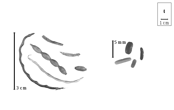 Fruit: A loment (or a loment segment); 1–5 cm long; 0.1–0.3 cm wide; 0.1–0.25 cm thick; 2–9 times longer than wide to more than 9 times longer than wide; with deciduous androecial sheath; with deciduous corolla; with persistent calyx; with calyx shorter than fruit; without orifice formed by curving of fruit or fruit segments; straight to curved; not plicate; not twisted; symmetrical; linear, or moniliform; not inflated; compressed, or terete; with beak; straight; with solid beak the same color and texture as fruit; short tapered at apex; aligned with longitudinal axis of fruit; short tapered at base; aligned with longitudinal axis of fruit; with the apex and base uniform in texture, or differing in texture; upper 3/4 barely inflated, reticulate, and pubescent and lower 1/4 not inflated, reticulate, or pubescent; coriaceous; seed chambers externally visible, or invisible; seed chambers with the raised seed chambers not torulose; margin constricted, or not constricted; margin constricted along both margins; margin without sulcus; margin plain; wing(s) absent; nonstipitate; indehiscent. Replum invisible. Loment indehiscent; segments (articles) inconspicuous; segments (articles) 4.5–5.5 mm long; segments (articles) widest across each end, or seed area; segments (articles) with apical 1 different shape than middle one(s), or basal 1 different shape than middle one(s); segments (articles) oblong, or quadrangular. Epicarp dull, or glaucous; monochrome; brown, or tan; with surface texture uniform; glabrous; glandular, or eglandular; with glandular dots; limited to a portion of fruit; upper 3/4 glandular and lower 1/4 eglandular; without spines; not smooth; with elevated features; veined; longitudinally veined relative to fruit length; not tuberculate; not exfoliating; without cracks; without embedded tissue, much thicker than epicarp, running from base to apex. Mesocarp absent. Endocarp present; visible; glossy; opaque; monochrome, or bichrome (with central reddish-brown band); tan; smooth; without adhering pieces of testa; nonseptate; chartaceous; not exfoliating; remaining fused to epicarp; without wings; entire. Seed(s) 1–7; length parallel with fruit length; neither overlapping nor touching; in 2 or more series. Funiculus of 1 length only; thick; straight. Aril absent.