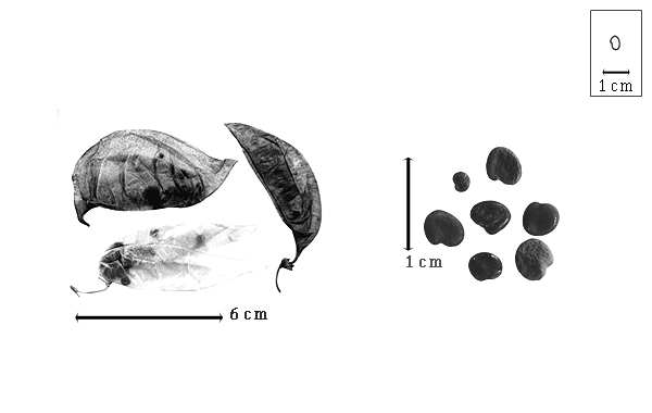 Fruit: A legume; unilocular; 3–7 cm long; 2–3 cm wide; 2–3 cm thick; 2–9 times longer than wide, or length less than twice as long as width; with deciduous androecial sheath; with deciduous corolla; with deciduous calyx; without orifice formed by curving of fruit or fruit segments; straight; not plicate; not twisted; asymmetrical, or symmetrical; elliptic; with both sutures parallelly curved; inflated; terete; without beak, or with beak; straight, or declined; with solid beak the same color and texture as fruit; long tapered at apex, or tapered at apex, or short tapered at apex; aligned with longitudinal axis of fruit; short tapered at base, or rounded at base; aligned with longitudinal axis of fruit, or oblique with longitudinal axis of fruit; with the apex and base uniform in texture; membranous, or fragile, thinner than chartaceous, like Trifolium (more or less); seed chambers externally invisible; margin not constricted; margin without sulcus; margin plain; wing(s) absent; stipitate, or substipitate, or nonstipitate; with the stipe 0.1–10 mm long; indehiscent, or with all layers dehiscing (at apex); splitting along suture(s) (at apex). Dehiscence of valves passive. Replum invisible. Epicarp dull; monochrome, or multicolored; mottled and streaked; tan; with purple overlay; with surface texture uniform; glabrous, or pubescent but soon deciduous; with hairs erect; with 1 type of pubescence; with pubescence uniformly distributed; with simple hairs; pliable; eglandular; without spines; not smooth; with elevated features; veined; reticulately veined; not tuberculate; wrinkled (on drying); not exfoliating; without cracks; without embedded tissue, much thicker than epicarp, running from base to apex. Mesocarp present, or absent; thin; surface not veined; 1-layered; without balsamic vesicles; without fibers; without reniform canals; solid; chartaceous. Endocarp present; visible; dull; opaque; monochrome; tan; smooth; without adhering pieces of testa; nonseptate; chartaceous; not exfoliating; remaining fused to mesocarp and epicarp; remaining fused to epicarp; without wings; entire. Seed(s) 12–15; length transverse to fruit length; neither overlapping nor touching; in 1 series. Funiculus 2 mm long; of 1 length only; filiform, or thick; straight, or curved. Aril present; dry; when dry tongue-aril; entire; tan.