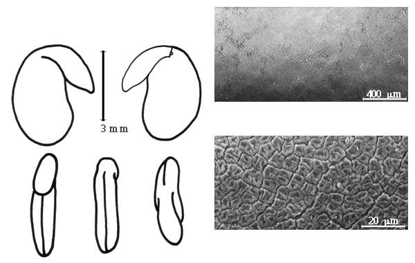 Seed: 2–4.5 mm long; 2–4 mm wide; 1–1.8 mm thick; not overgrown; not angular; asymmetrical; oblong, or reniform (sub); compressed; with surface smooth; with visible radicle and cotyledon lobes, or without visible radicle and cotyledon lobes; without external groove between radicle and cotyledon lobes; without hilar sinus; without umbo on seed faces; without medial ridge on each face. Cuticle not exfoliating; not inflated; not wrinkled. Testa present; without pieces of adhering epicarp; not adhering to endocarp; free from endocarp; dull; not modified by a bloom; colored; monochrome, or streaked (faintly and occasionally); with infrequent streaks; dark reddish or blackish brown, or black (nearly); with tan overlay (green); glabrous; smooth, or not smooth; with recessed features; pitted with small separate pits; coriaceous. Pleurogram absent. Pseudopleurogram absent. Fracture lines absent. Rim absent. Wing(s) absent. Raphe not visible. Hilum present; partially concealed; concealed by aril; with faboid split; with the lips of the faboid split the same color as the rest of the hilum; larger than punctiform; 0.5 mm long; with curved outline; circular; marginal according to radicle tip, or between cotyledon and radicle lobe; recessed; within rim; rim color lighter than testa. Lens not discernible, or discernible (faint); 1 mm long; with margins straight, or curved; oblong; elliptic, or oblong; not in groove of raphe; adjacent to hilum; 0.2 mm from hilum; mounded; similar color as testa; lighter than testa and darker than testa; reddish brown, or tan (reddish); not within corona, halo, or rim. Endosperm present (clear to reddish-tan); thick; not pluglike and not resembling tip of radicle; covering entire embryo; adnate to embryo. Cotyledons smooth; both outer faces convex; both the same thickness; both more or less of equal length; not folded; margin entire 180 degrees from base of radicle; similar at apex; not concealing radicle; entire over radicle; without lobes; with the interface division terminating at base of radicle; without margins recessed; light reddish tan, or yellow; inner face concave; glabrous on inner face. Embryonic axis deflexed; oblique to length of seed; without a joint evident between the radicle and the cotyledons. Radicle differentiated from cotyledon; bulbose; deflexed and parallel to cotyledon length; centered between cotyledons; less than 1/2 length of cotyledons, or 1/2 to nearly length of cotyledons. Plumule rudimentary; glabrous.