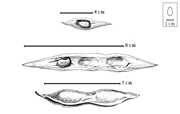 Fruit: A legume; unilocular; 6–15 cm long; 1–1.6 cm wide; 0.2–0.5 cm thick; 2–9 times longer than wide; with deciduous androecial sheath; with deciduous corolla; with deciduous calyx; without orifice formed by curving of fruit or fruit segments; straight; not plicate; not twisted; asymmetrical; fusiform to oblong; not inflated; compressed; without beak; long long tapered at apex; aligned with longitudinal axis of fruit; long tapered at base; aligned with longitudinal axis of fruit; with the apex and base uniform in texture; coriaceous; seed chambers externally visible; margin constricted, or not constricted (not constricted in 1-seeded fruits); margin constricted along both margins, or slightly constricted along both margins; margin without sulcus; margin embellished; margin with wing(s); wing(s) present; wing(s) 4; wing(s) 0.1–2 mm wide; wing(s) sutural; wing(s) on both sutures; substipitate; with all layers dehiscing; splitting along suture(s). Dehiscence of valves along both sutures; passive. Replum invisible. Epicarp dull; monochrome to multicolored; bichrome; brownish to reddish yellow ((wings darker colored)); with surface texture uniform; glabrous; eglandular; without spines; not smooth; with elevated features; veined; longitudinally veined relative to fruit length and reticulately veined; not tuberculate; not exfoliating (but cracking along veins); without cracks; without embedded tissue, much thicker than epicarp, running from base to apex. Mesocarp present; surface not veined; 1-layered; without balsamic vesicles; with fibers; without reniform canals; fibrous throughout; coriaceous. Endocarp present; visible; glossy; opaque; monochrome; tan; without adhering pieces of testa; nonseptate; not exfoliating; remaining fused to mesocarp and epicarp; entire. Seed(s) 1–4; length parallel with fruit length; neither overlapping nor touching; in 1 series. Funiculus 3–6 mm long; of 1 length only; thick; straight. Aril absent.