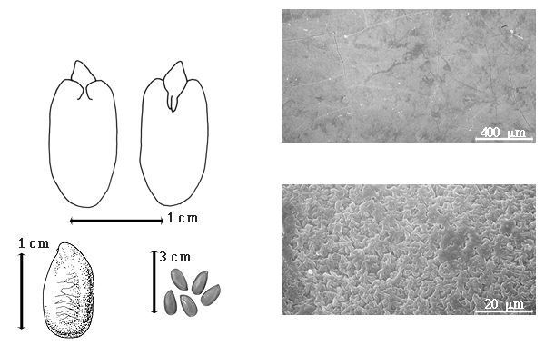 Seed: 10–14 mm long; 6.5–7 mm wide; 4–5 mm thick; not overgrown; not angular; symmetrical; oblong; compressed; with surface smooth; without visible radicle and cotyledon lobes; without hilar sinus; without umbo on seed faces; without medial ridge on each face. Cuticle not exfoliating; not inflated; not wrinkled. Testa present; without pieces of adhering epicarp; not adhering to endocarp; free from endocarp; glossy; not modified by a bloom; colored; bichrome; yellowish brown; glabrous; smooth; osseous. Pleurogram absent. Pseudopleurogram absent. Fracture lines present; reticulate. Rim absent. Wing(s) absent. Raphe visible (near lens). Hilum present; visible; without faboid split; punctiform; subapical to radicle tip; recessed; not within corona, halo, or rim. Lens discernible; 0.2 mm long; with margins curved; elliptic; not in groove of raphe; mounded; slight same color as testa; not within corona, halo, or rim. Endosperm present; thick; not pluglike and not resembling tip of radicle; adnate to testa. Cotyledons smooth; both outer faces convex; both the same thickness; both more or less of equal length; not folded; margin entire 180 degrees from base of radicle; similar at apex; partially concealing radicle (lower one-third); with lobes; with lobes touching (auriculate); without basal groin formed by lobes; with the interface division terminating at base of radicle; without margins recessed; inner face flat; glabrous on inner face. Embryonic axis straight; parallel to length of seed; without a joint evident between the radicle and the cotyledons. Radicle differentiated from cotyledon; centered between cotyledons. Plumule well developed; glabrous.
