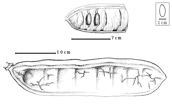 Fruit: A legume; unilocular; 26–27 cm long; 4–6 cm wide; 1–1.2 cm thick; 2–9 times longer than wide; with deciduous androecial sheath; with deciduous corolla; with deciduous calyx; without orifice formed by curving of fruit or fruit segments; straight; not plicate; not twisted; symmetrical; oblong; not inflated; flattened; without beak; long tapered at apex; aligned with longitudinal axis of fruit; short tapered at base; aligned with longitudinal axis of fruit; with the apex and base uniform in texture; ligneous; seed chambers externally visible (faint); margin not constricted; margin without sulcus; margin embellished; margin with wing(s); wing(s) present; wing(s) 1; wing(s) 5–12 mm wide; wing(s) sutural; wing(s) on 1 suture; substipitate; with all layers dehiscing; splitting along suture(s). Dehiscence of valves along both sutures; passive. Replum invisible. Epicarp dull to glossy; monochrome; dark brown; with surface texture uniform; glabrous; eglandular; without spines; not smooth; with elevated features; not veined; not tuberculate; rugose; checking and breaking into large plates but not exfoliating; with cracks; cracking transverse to fruit length; without embedded tissue, much thicker than epicarp, running from base to apex. Mesocarp present; surface not veined; 2-layered; without balsamic vesicles; with fibers; without reniform canals; with fibers longitudinally over mealy tissue; ligneous. Endocarp present; visible; dull; opaque; monochrome; tan; without adhering pieces of testa; subseptate; not exfoliating; remaining fused to mesocarp and epicarp; entire. Seed(s) 11–15; length transverse to fruit length; neither overlapping nor touching; in 1 series. Funiculus 6–7 mm long; of 1 length only; thick; curved (near the seed). Aril absent.