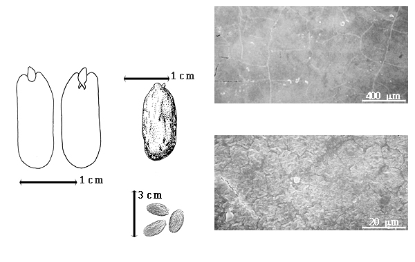 Seed: 17–78 mm long; 7–10 mm wide; 3–4 mm thick; not overgrown; not angular; symmetrical, or asymmetrical; oblong to D-shaped; compressed; with surface smooth; without visible radicle and cotyledon lobes; without hilar sinus; without umbo on seed faces; without medial ridge on each face. Cuticle not exfoliating; not inflated; not wrinkled. Testa present; without pieces of adhering epicarp; not adhering to endocarp; free from endocarp; glossy; not modified by a bloom; colored; mottled; brown and yellow; with brown overlay; glabrous; smooth; osseous. Pleurogram absent. Pseudopleurogram absent. Fracture lines present; reticulate (in a concentric manner). Rim absent. Wing(s) absent. Raphe not visible. Hilum present; fully concealed; concealed by funicular remnant; without faboid split; punctiform; subapical to radicle tip; flush; not within corona, halo, or rim. Lens discernible; 0.3–0.5 mm long; with margins curved; elliptic; not in groove of raphe; mounded, or flush; dissimilar color from testa; black, or tan; not within corona, halo, or rim. Endosperm present; thin; not pluglike and not resembling tip of radicle; adnate to testa. Cotyledons smooth; both outer faces convex; both the same thickness; both more or less of equal length; not folded; margin entire 180 degrees from base of radicle; similar at apex; partially concealing radicle; with lobes; with lobes not touching; with the interface division terminating at base of radicle; without margins recessed; inner face flat; glabrous on inner face. Embryonic axis straight; parallel to length of seed; without a joint evident between the radicle and the cotyledons. Radicle differentiated from cotyledon; centered between cotyledons. Plumule well developed; glabrous.