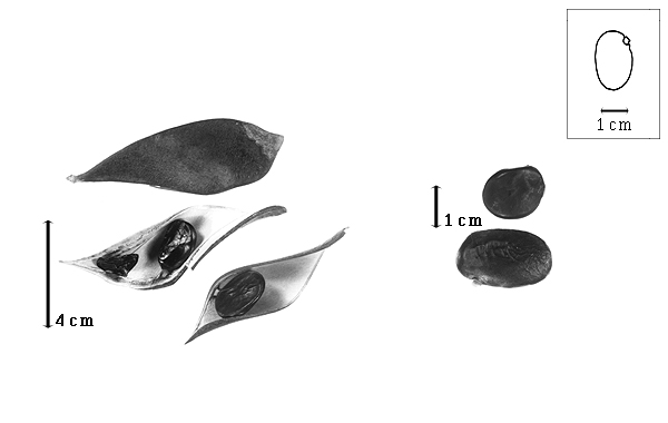 Fruit: A legume; unilocular; 7–11 cm long; 2.5–3.5 cm wide; 2–9 times longer than wide; with deciduous androecial sheath; with deciduous corolla; with deciduous calyx; without orifice formed by curving of fruit or fruit segments; straight; not plicate; not twisted; asymmetrical; irregular, or obliquely obovate; with both sutures unequally curved; not inflated; compressed; with beak; straight, or declined; with solid beak the same color and texture as fruit; tapered at apex, or short tapered at apex; aligned with longitudinal axis of fruit, or oblique with longitudinal axis of fruit; long tapered at base, or tapered at base; aligned with longitudinal axis of fruit, or oblique with longitudinal axis of fruit; with the apex and base uniform in texture; coriaceous, or leathery; seed chambers externally invisible; margin not constricted; margin without sulcus; margin plain, or embellished; margin with thickened sutural areas; wing(s) absent; nonstipitate; with all layers dehiscing; splitting along suture(s). Dehiscence of valves along both sutures; apical and down; active; with valves twisting. Replum invisible. Epicarp dull; monochrome, or multicolored; mottled, or streaked; brown; with brown overlay (darker); mottling color combination variable; with surface texture uniform; glabrous; eglandular; without spines; not smooth; with recessed features; not veined; not tuberculate; slitted obliquely; not exfoliating, or exfoliating in part; without cracks, or with cracks; cracking oblique to fruit length; without embedded tissue, much thicker than epicarp, running from base to apex. Mesocarp present; thick; surface not veined, or uniformly veined; 2-layered; without balsamic vesicles; without fibers; without reniform canals; with solid layer over solid layer, or spongy layer over solid layer; coriaceous. Endocarp present; visible; dull; opaque; monochrome, or mottled; tan, or white; with mottling dark more or less uniform; with brown overlay; scurfy and transversely wrinkled; without adhering pieces of testa; nonseptate; chartaceous; not exfoliating; remaining fused to mesocarp and epicarp; without wings; entire. Seed(s) 1–2(–6); length oblique to fruit length; neither overlapping nor touching, or touching; in 1 series. Funiculus ca. 1 mm long; of 1 length only; flattened; straight, or triangular. Aril present; dry; when dry rim-aril and tongue-aril; entire; brown, or cream, or tan, or yellow.