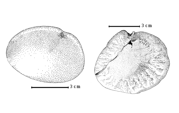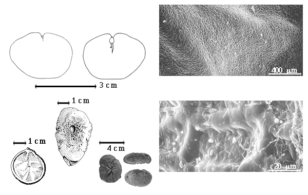 Seed: 25–70 mm long; 22–60 mm wide; 5–30 mm thick; not overgrown; not angular; symmetrical; circular to oblong, or lanceolate, or irregular; compressed; with surface smooth; without visible radicle and cotyledon lobes; without hilar sinus; without umbo on seed faces; without medial ridge on each face. Cuticle not exfoliating; not inflated; not wrinkled. Testa present; without pieces of adhering epicarp; not adhering to endocarp; free from endocarp; glossy to dull; not modified by a bloom; colored; monochrome; reddish brown; glabrous; smooth, or not smooth; with elevated features, or recessed features; rugose; pitted with small separate pits; chartaceous. Pleurogram absent. Pseudopleurogram absent. Fracture lines absent. Rim absent. Wing(s) absent. Raphe visible, or not visible (when present extending from hilum to basal lens). Hilum present; fully concealed; concealed by funicular remnant; without faboid split; larger than punctiform; 0.1–4 mm long; with curved outline; elliptic to circular; apical according to radicle tip but marginal according to seed length; flush (?); not within corona, halo, or rim. Lens discernible, or not discernible; 0.1–5 mm long; with margins curved; elliptic; not in groove of raphe; mounded; similar color as testa; darker than testa; not within corona, halo, or rim. Endosperm absent. Cotyledons smooth; both outer faces convex; both the same thickness; both more or less of equal length; not folded; margin entire 180 degrees from base of radicle; similar at apex; partially concealing radicle (only tip exposed), or completely concealing radicle; notched at radicle and split over radicle, or notched at radicle (only); with the interface division terminating at base of radicle; without margins recessed; inner face concave; glabrous on inner face. Embryonic axis straight; parallel to length of seed to perpendicular to length of seed; without a joint evident between the radicle and the cotyledons. Radicle differentiated from cotyledon; centered between cotyledons. Plumule well developed; glabrous.
