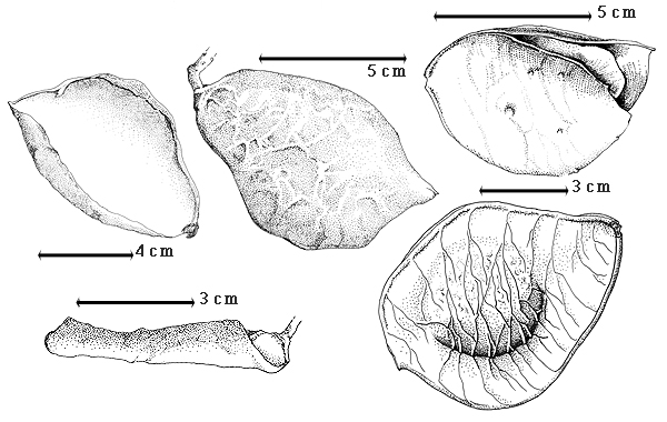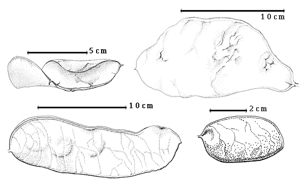 Fruit: A legume; unilocular; 3–30 cm long; 1.5–8.5 cm wide; 1–2.5 cm thick; length less than twice as long as width to 2–9 times longer than wide; with deciduous androecial sheath; with deciduous corolla; with deciduous calyx; without orifice formed by curving of fruit or fruit segments; curved; not plicate; not twisted; asymmetrical; ovate, or elliptic, or oblong, or circular; not inflated; compressed to terete (subterete); without beak; tapered at apex; aligned with longitudinal axis of fruit to oblique with longitudinal axis of fruit; short tapered at base to rounded at base; aligned with longitudinal axis of fruit; with the apex and base uniform in texture; coriaceous to ligneous; seed chambers externally visible; margin not constricted; margin without sulcus; margin plain; wing(s) absent; substipitate; tardily dehiscent or with all layers dehiscing; splitting along suture(s). Dehiscence of valves along both sutures (sometimes initially along the ventral margin); active; with valves separately enrolling. Replum invisible. Epicarp dull; monochrome; brown; with surface texture uniform; pubescent and indurate (velvety reddish brown); with hairs erect; eglandular; without spines; not smooth; with elevated features; veined; transversely veined relative to fruit length; not tuberculate; not exfoliating; without cracks; without embedded tissue, much thicker than epicarp, running from base to apex. Mesocarp present; surface not veined; 1-layered; without balsamic vesicles; without fibers; without reniform canals; solid; ligneous. Endocarp present; visible; dull; opaque; monochrome; brown to white; without adhering pieces of testa; nonseptate; not exfoliating; remaining fused to mesocarp and epicarp; entire. Seed(s) 1–5; length transverse to fruit length; neither overlapping nor touching; in 1 series. Funiculus 0.1–1 mm long; of 1 length only; flattened; straight. Aril absent.