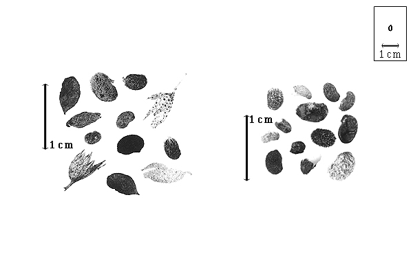 Seed: 2.5–5 mm long; 1.5–3.5 mm wide; 1–2.5 mm thick; not overgrown; not angular; asymmetrical; reniform; compressed; with visible radicle and cotyledon lobes, or without visible radicle and cotyledon lobes; without external groove between radicle and cotyledon lobes; without hilar sinus; without umbo on seed faces; without medial ridge on each face. Cuticle not exfoliating; not inflated; not wrinkled. Testa present; with pieces of adhering epicarp; partially adhering to endocarp; free from endocarp; somewhat glossy; not modified by a bloom; colored; monochrome, or mottled; with frequent mottles; reddish brown, or green (brownish); with brownish black overlay; glabrous; smooth (when partially adhering endocarp not considered); coriaceous. Pleurogram absent. Pseudopleurogram absent. Fracture lines absent. Rim absent. Raphe not visible. Hilum present; fully concealed; concealed by funiculus, or funicular remnant; without faboid split; punctiform; marginal according to radicle tip; recessed; within corona; corona color lighter than testa (reddish to yellowish). Lens not discernible. Endosperm present; thin; not pluglike and not resembling tip of radicle; covering entire embryo; adnate to testa. Cotyledons smooth; both outer faces convex; both the same thickness; both more or less of equal length; not folded; margin entire 180 degrees from base of radicle; similar at apex; not concealing radicle; entire over radicle; without lobes; with the interface division terminating in radicle tissue; without margins recessed; yellow; inner face flat; glabrous on inner face. Embryonic axis deflexed; parallel to length of seed; without a joint evident between the radicle and the cotyledons. Radicle differentiated from cotyledon; linear; deflexed and parallel to cotyledon length; centered between cotyledons; 1/2 to nearly length of cotyledons. Plumule rudimentary; glabrous.