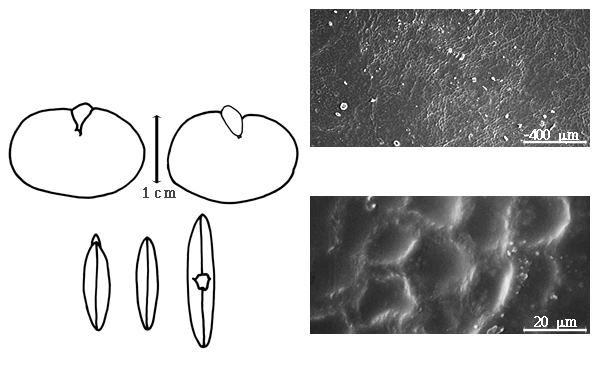 Seed: 17–22 mm long; 16–21 mm wide; 2.5–3 mm thick; not overgrown; not angular; symmetrical to asymmetrical; elliptic to ovate, or irregular; flattened; with surface smooth; with visible radicle and cotyledon lobes; without external groove between radicle and cotyledon lobes; without hilar sinus; without umbo on seed faces; without medial ridge on each face. Cuticle not exfoliating; not inflated; not wrinkled. Testa present; without pieces of adhering epicarp; not adhering to endocarp; free from endocarp; dull; not modified by a bloom; colored; monochrome, or mottled; with infrequent mottles; orange; with brown overlay; glabrous; not smooth; with elevated features; wrinkled; chartaceous. Pleurogram absent. Pseudopleurogram absent. Fracture lines absent. Rim absent. Wing(s) absent. Raphe visible; from hilum through base of seed and up the other side; not bifurcating; darker than testa; brown; raised. Hilum present; fully concealed; concealed by funicular remnant; larger than punctiform; ca. 0.5 mm long; with curved outline; elliptic; subapical to radicle tip; flush; not within corona, halo, or rim. Lens not discernible. Endosperm absent. Cotyledons smooth; both outer faces convex; both the same thickness; both more or less of equal length; not folded; margin entire 180 degrees from base of radicle; similar at apex; partially concealing radicle; notched at radicle; with lobes; with lobes not touching; without basal groin formed by lobes; with the interface division terminating at base of radicle; without margins recessed; brown; inner face flat; glabrous on inner face. Embryonic axis straight; oblique to length of seed; without a joint evident between the radicle and the cotyledons. Radicle differentiated from cotyledon; bulbose; lobe tip straight; straight with embryonic axis; centered between cotyledons; less than 1/2 length of cotyledons. Plumule rudimentary; glabrous.