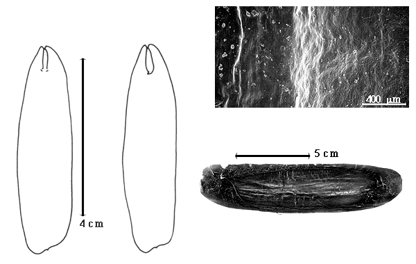 Fruit: A legume; unilocular; 60–75 cm long; 3.5–4 cm wide; 0.2–0.3 cm thick; more than 9 times longer than wide; with deciduous androecial sheath; with deciduous corolla; with deciduous calyx; without orifice formed by curving of fruit or fruit segments; straight; not plicate; not twisted; asymmetrical; linear; not inflated; compressed; without beak; rounded at apex; aligned with longitudinal axis of fruit; short tapered at base; oblique with longitudinal axis of fruit; with the apex and base uniform in texture; coriaceous; seed chambers externally invisible; margin not constricted; margin without sulcus; margin plain; wing(s) absent; nonstipitate; with all layers dehiscing; splitting along suture(s). Dehiscence of valves along 1 suture, or both sutures (dehiscing and reflexing ventrally first, eventually opening along dorsal suture); medial and up and down; active, or passive; with valves occassionally twisting. Replum invisible. Epicarp dull, or glossy; monochrome; brown; with surface texture uniform; pubescent but soon deciduous; with hairs erect; velutinous; with simple hairs; eglandular; without spines; not smooth; with elevated features; faintly veined (after dehiscence of hairs); reticulately veined; not tuberculate; exfoliating; without cracks; without embedded tissue, much thicker than epicarp, running from base to apex. Mesocarp present; surface not veined; 1-layered; without balsamic vesicles; with fibers; without reniform canals; fibrous throughout; ligneous. Endocarp present; visible; dull; opaque; monochrome; brown; smooth; without adhering pieces of testa; nonseptate; not exfoliating; remaining fused to mesocarp and epicarp; entire. Seed(s) unknown number; length parallel with fruit length; overlapping; in 1 series. Funiculus ca. 50 mm long; of 1 length only; filiform; S-curved. Aril absent.