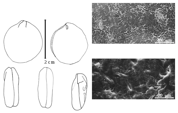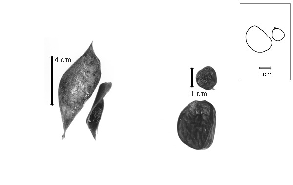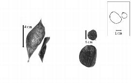 Seed: 12–25 mm long; 10–24 mm wide; 2.5–11 mm thick; not overgrown; not angular; symmetrical, or asymmetrical; ovate, or irregular; compressed, or flattened; with surface wrinkled; without visible radicle and cotyledon lobes; without hilar sinus; without umbo on seed faces; without medial ridge on each face. Cuticle not exfoliating; not inflated; not wrinkled. Testa present; without pieces of adhering epicarp; not adhering to endocarp; free from endocarp; dull, or dull and glossy; not modified by a bloom; colored; monochrome; black to brown (dark); glabrous; not smooth; with elevated features; wrinkled; coriaceous, or chartaceous. Pleurogram absent. Pseudopleurogram absent. Fracture lines absent. Rim absent. Wing(s) absent. Raphe visible; from hilum through lens and terminating before base of seed; not bifurcating; color of testa; raised. Hilum present; fully concealed; concealed by funicular remnant and aril, or funicular remnant, or aril; without faboid split; larger than punctiform; 1.7–2 mm long; with curved outline; circular, or elliptic; apical at apex of radicle tip; flush; not within corona, halo, or rim. Lens discernible; 1.5–3 mm long; with margins straight; linear; not in groove of raphe; confluent with hilum; flush; same color as testa; black, or brown; not within corona, halo, or rim. Endosperm absent. Cotyledons not smooth; wrinkled; both outer faces convex; both the same thickness; both more or less of equal length; not folded; margin entire 180 degrees from base of radicle; similar at apex; completely concealing radicle; split over radicle; without lobes; with the interface division terminating at base of radicle; without margins recessed; orange; inner face flat; glabrous on inner face. Embryonic axis straight; parallel to length of seed; without a joint evident between the radicle and the cotyledons. Radicle differentiated from cotyledon; bulbose; lobe tip straight; straight with embryonic axis; centered between cotyledons; less than 1/2 length of cotyledons. Plumule rudimentary; glabrous.