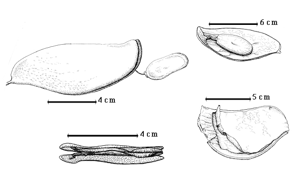 Fruit: A legume; unilocular; 4–12 cm long; 2–6 cm wide; 0.4–0.7 cm thick; 2–9 times longer than wide; with deciduous androecial sheath; with deciduous corolla; with deciduous calyx; without orifice formed by curving of fruit or fruit segments; straight; not plicate; not twisted; asymmetrical; with nearly 1 straight and 1 curved suture; widest near middle or D-shaped, or widest near apex (stated as "oblong"); not inflated; flattened; without beak; long tapered at apex to tapered at apex; aligned with longitudinal axis of fruit to right-angled with longitudinal axis of fruit; tapered at base to rounded at base; aligned with longitudinal axis of fruit to oblique with longitudinal axis of fruit; with the apex and base uniform in texture; coriaceous to ligneous (or nearly so); seed chambers externally invisible; margin not constricted; margin without sulcus; margin plain; wing(s) absent; substipitate; with all layers dehiscing; splitting along suture(s). Dehiscence of valves along both sutures; passive (seed remaining with one valve excluding endocarp and falling as a unit). Replum invisible. Epicarp nearly glossy; monochrome; tannish brown; with surface texture uniform; glabrous; eglandular; without spines; smooth; not veined; not tuberculate; not exfoliating; without cracks; without embedded tissue, much thicker than epicarp, running from base to apex. Mesocarp absent. Endocarp present; visible; dull; opaque; monochrome; tannish brown to white; without adhering pieces of testa; curling up at apex and separating from 1 epicarp, nonseptate; not exfoliating; entire. Seed(s) 1 (apical); length parallel with fruit length. Funiculus 0.1–20 mm long; of 1 length only; flattened; curved to plicate (once). Aril absent (arillike funicular remnant present).