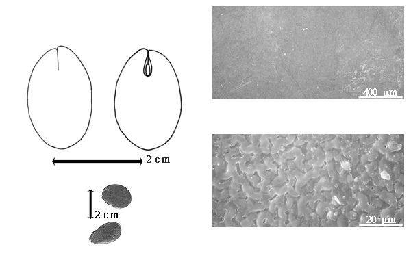Seed: 20–55 mm long; 13–20 mm wide; 2–7 mm thick; not overgrown; not angular; symmetrical; elliptic to oblong; flattened; with surface smooth; without visible radicle and cotyledon lobes; without hilar sinus; without umbo on seed faces; without medial ridge on each face. Cuticle not exfoliating; not inflated; not wrinkled. Testa present; without pieces of adhering epicarp; not adhering to endocarp; free from endocarp; dull; not modified by a bloom; colored; monochrome; blackish brown; glabrous; smooth; osseous. Pleurogram absent. Pseudopleurogram absent. Fracture lines present; not stated. Rim absent. Wing(s) absent. Raphe not visible. Hilum present; fully concealed; concealed by funicular remnant; without faboid split; larger than punctiform; 0.1–1.5 mm long; with curved outline; elliptic; apical at apex of radicle tip to subapical to radicle tip; raised; not within corona, halo, or rim. Lens not discernible. Endosperm present (trace); trace; not pluglike and not resembling tip of radicle; restricted to region of embryo (around cotyledon split and radicle tip). Cotyledons smooth; both outer faces convex; both the same thickness; both more or less of equal length; not folded; margin entire 180 degrees from base of radicle; similar at apex; completely concealing radicle; split over radicle; with the interface division terminating at base of radicle; without margins recessed; inner face flat; glabrous on inner face. Embryonic axis straight; parallel to length of seed; without a joint evident between the radicle and the cotyledons. Radicle differentiated from cotyledon; centered between cotyledons. Plumule rudimentary; glabrous.