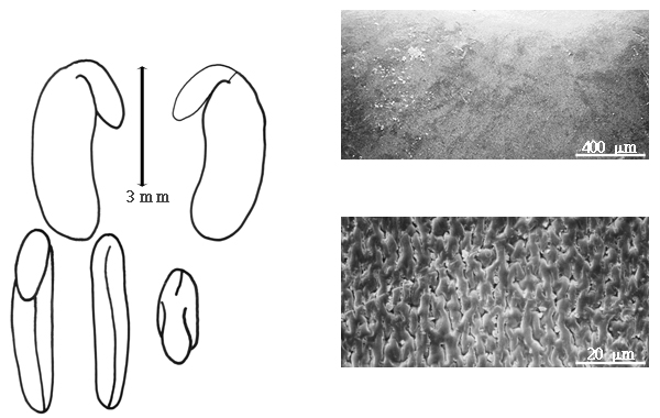 Seed: 3–6 mm long; 1.5–3.5 mm wide; 0.8–2.4 mm thick; overgrown, 1 seed filling entire fruit cavity; not angular; asymmetrical; oblong, or elliptic; compressed; with surface smooth; without visible radicle and cotyledon lobes; without hilar sinus; without umbo on seed faces; without medial ridge on each face. Cuticle not exfoliating; not inflated; not wrinkled. Testa present; without pieces of adhering epicarp; not adhering to endocarp; free from endocarp; glossy; not modified by a bloom; colored; monochrome, or mottled and streaked; with frequent mottles; with frequent streaks; brown to greenish or reddish brown, or tan (to reddish tan), or yellow, or orange, or black; with black overlay; glabrous; smooth, or not smooth; with recessed features; punctate; coriaceous. Pleurogram absent. Pseudopleurogram absent. Fracture lines absent. Rim absent. Wing(s) absent. Raphe not visible. Hilum present; partially concealed; concealed by aril; with faboid split; with the lips of the faboid split the same color as the rest of the hilum; larger than punctiform; 1 mm long; with straight outline; oblong; marginal according to radicle tip; recessed; not within corona, halo, or rim, or within halo; halo darker than testa (black). Lens discernible, or not discernible; with margins curved; elliptic; not in groove of raphe; confluent with hilum (at least with halo); mounded; dissimilar color from testa; darker than testa; black; not within corona, halo, or rim. Endosperm present; thin; not pluglike and not resembling tip of radicle; covering entire embryo; adnate to testa, or embryo. Cotyledons smooth; both outer faces convex; both more or less of equal length; not folded; margin entire 180 degrees from base of radicle; similar at apex; not concealing radicle; split over radicle; with lobes; with the interface division terminating at base of radicle; without margins recessed; yellow; inner face flat; glabrous on inner face. Embryonic axis deflexed; oblique to length of seed; without a joint evident between the radicle and the cotyledons. Radicle differentiated from cotyledon; linear; lobe tip straight; deflexed and parallel to cotyledon length; centered between cotyledons; less than 1/2 length of cotyledons. Plumule rudimentary; glabrous.