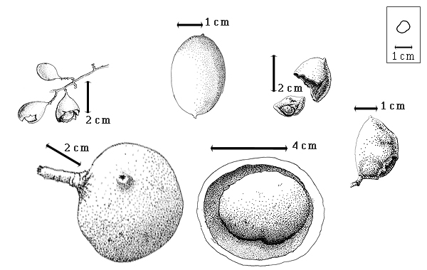 Fruit and seed: D. guianense (J.B.C.F. Aublet) Sandwith - top left fruiting cluster with broken and entire fruits; D. maingayi Baker - top center entire fruit; D. modestum (C.G.G.J. van Steenis) Steyaert - bottom left entire fruit, bottom center opened fruit with endocarp in situ; D. pierrei E.A.J. De Wildeman - top right epicarp (upper) and endocarp containing 1 seed (lower), right center entire fruit.