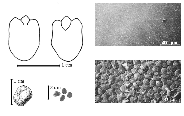 Seed: 7–50 mm long; 5–40 mm wide; 3–35 mm thick; not overgrown; not angular; symmetrical, or asymmetrical; ovate to circular, or irregular (slightly); compressed (often concaved in center of each face); with surface smooth; without visible radicle and cotyledon lobes; without hilar sinus; without umbo on seed faces; without medial ridge on each face. Cuticle not exfoliating; not inflated; not wrinkled. Testa present; without pieces of adhering epicarp; not adhering to endocarp; free from endocarp; glossy to dull (absent in D. modestum); not modified by a bloom; colored; monochrome, or bichrome, or mottled; brown; glabrous; smooth, or not smooth; with elevated features; shagreen (if cuticle blistered); osseous. Pleurogram absent. Pseudopleurogram absent. Fracture lines present; longitudinal (conspicuous and curving from hilum to lens). Rim absent. Wing(s) absent. Raphe not visible (?). Hilum present; fully concealed; concealed by funicular remnant; without faboid split; punctiform; subapical to radicle tip; flush; not within corona, halo, or rim. Lens discernible (90–170 degrees from hilum); 1.5 mm long; with margins curved; elliptic; not in groove of raphe; recessed; dissimilar color from testa; black; not within corona, halo, or rim. Endosperm present; thick; not pluglike and not resembling tip of radicle; adnate to embryo. Cotyledons smooth; both outer faces convex; both the same thickness; thicker 1 longer than other; not folded; margin entire 180 degrees from base of radicle; similar at apex; partially concealing radicle; with lobes (one lobe longer than the other); with lobes not touching; with the interface division terminating at base of radicle; without margins recessed; green to white; inner face flat; glabrous on inner face. Embryonic axis straight; parallel to length of seed; without a joint evident between the radicle and the cotyledons. Radicle differentiated from cotyledon; centered between cotyledons. Plumule rudimentary to moderately developed; glabrous.