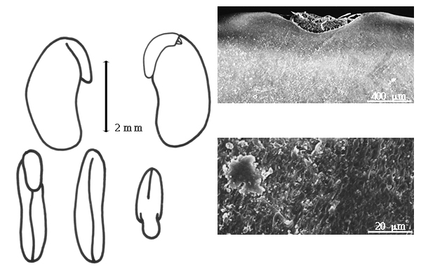 Seed: 0.7–12.5 mm long; 0.5–5 mm wide; 0.5–1 mm thick; not overgrown; not angular; asymmetrical; D-shaped, or oblong, or quadrangular, or rectangular, or reniform, or linear; flattened, or compressed; with surface grooved (D. oojeinensis (W. Roxburgh) H. $$Ohasi), or smooth; longitudinal and oblique; without visible radicle and cotyledon lobes; without hilar sinus; without umbo on seed faces; without medial ridge on each face. Cuticle not exfoliating; not inflated; not wrinkled. Testa present; without pieces of adhering epicarp; not adhering to endocarp; free from endocarp; dull, or glossy; not modified by a bloom; colored; monochrome, or mottled and streaked; with frequent mottles; with frequent streaks; dark to light reddish brown to brown, or tan, or green, or olive (green); with brown overlay (dark reddish); glabrous; smooth, or not smooth; with elevated features, or recessed features; faintly wrinkled; pitted with small separate pits; chartaceous, or coriaceous. Pleurogram absent. Pseudopleurogram absent. Fracture lines absent. Rim absent. Wing(s) absent. Raphe not visible. Hilum present; visible, or fully concealed; concealed by funicular remnant; with faboid split, or without faboid split; with the lips of the faboid split the same color as the rest of the hilum; punctiform, or larger than punctiform; 0.1–1 mm long; with curved outline, or straight outline; circular; oblong, or linear; marginal according to radicle tip, or between cotyledon and radicle lobe; recessed; within rim, or not within corona, halo, or rim; rim color darker than testa. Lens discernible; 0.1–0.5 mm long; with margins straight, or curved; oblong; circular, or oblong, or elliptic, or 2 circular mounds separated by groove; not in groove of raphe; confluent with hilum; flush; dissimilar color from testa; darker than testa; reddish brown, or black, or yellow (reddish); not within corona, halo, or rim. Endosperm present, or absent; thin; not pluglike and not resembling tip of radicle; covering entire embryo; adnate to testa, or embryo. Cotyledons smooth, or not smooth; both outer faces convex; both the same thickness; both more or less of equal length; not folded; margin entire 180 degrees from base of radicle; similar at apex; not concealing radicle; entire over radicle; without lobes; with the interface division terminating at base of radicle; without margins recessed; yellow, or tan, or green; inner face flat; glabrous on inner face. Embryonic axis deflexed; oblique to length of seed; without a joint evident between the radicle and the cotyledons. Radicle differentiated from cotyledon; linear; deflexed and parallel to cotyledon length; centered between cotyledons; less than 1/2 length of cotyledons. Plumule moderately developed, or well developed, or rudimentary; glabrous.