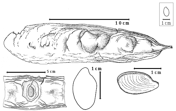 Fruit: A legume; unilocular; 15–35 cm long; 5–7 cm wide; 0.1–0.5 cm thick; 2–9 times longer than wide; with deciduous androecial sheath; with deciduous corolla; with deciduous calyx; without orifice formed by curving of fruit or fruit segments; straight to curved; not plicate; not twisted; symmetrical; broadly oblong; not inflated; flattened; without beak; short tapered at apex; aligned with longitudinal axis of fruit; tapered at base to rounded at base; aligned with longitudinal axis of fruit; with the apex and base uniform in texture; coriaceous; seed chambers externally faintly visible; margin not constricted; margin without sulcus; margin plain; wing(s) absent; stipitate; with the stipe up to 25 mm long; indehiscent. Replum invisible. Epicarp glossy; monochrome; brown (to blackish brown); with surface texture uniform; glabrous; eglandular; without spines; not smooth; with elevated features; faintly veined; reticulately veined; not tuberculate; prominent longitudinally wrinkled (paralleling both margins); not exfoliating; without cracks; without embedded tissue, much thicker than epicarp, running from base to apex. Mesocarp absent. Endocarp present; visible; dull; opaque; monochrome; tan; smooth; without adhering pieces of testa; nonseptate (though seed chambers fringed by spongy tissue); not exfoliating; entire. Seed(s) 5–10; length transverse to fruit length; neither overlapping nor touching; in 1 series. Funiculus to 13 mm long; of 1 length only; filiform; S-curved. Aril absent.