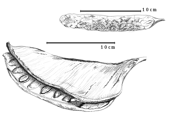 Fruit: A legume; unilocular; 11–23 cm long; 2.5–9 cm wide; 0.5–1.6 cm thick; 2–9 times longer than wide; with deciduous androecial sheath; with deciduous corolla; with deciduous calyx; without orifice formed by curving of fruit or fruit segments; straight to curved; not plicate; not twisted; symmetrical, or asymmetrical; linear, or falcate, or C-shaped, or harp-shaped (nearly); with both sutures parallelly curved, or both sutures unequally curved; not inflated; compressed; without beak; tapered at apex; aligned with longitudinal axis of fruit; short tapered at base; aligned with longitudinal axis of fruit; with the apex and base uniform in texture; ligneous (subfleshy when fresh); seed chambers externally invisible, or visible; margin not constricted; margin without sulcus; margin plain; wing(s) absent; stipitate; with the stipe 6–140 mm long; indehiscent, or with all layers dehiscing (elastically); splitting along suture(s). Dehiscence of valves along 1 suture, or both sutures; active, or passive; with valves twisting, or revolute. Replum invisible. Epicarp dull; monochrome; brown; with surface texture uniform; glabrous; eglandular; without spines; not smooth; with elevated features; veined; transversely veined relative to fruit length; not tuberculate; rugose; checking and exfoliating, or not exfoliating; with cracks; cracking longitudinal to fruit length; without embedded tissue, much thicker than epicarp, running from base to apex. Mesocarp present; surface not veined; 1-layered, or 2-layered; without balsamic vesicles; without fibers; without reniform canals; solid; with spongy layer over solid layer; ligneous. Endocarp present; visible; dull; opaque; monochrome; white, or tan; smooth, or fibrous; without adhering pieces of testa; septate; exfoliating, or not exfoliating (tearing during dehiscence or spongy in indehiscent fruits); remaining fused to mesocarp and epicarp; entire. Seed(s) 7–21; length transverse to fruit length; neither overlapping nor touching; in 1 series. Funiculus 0.1–3 mm long; of 1 length only; filiform; 1- plicate and straight, or triangular. Aril absent.