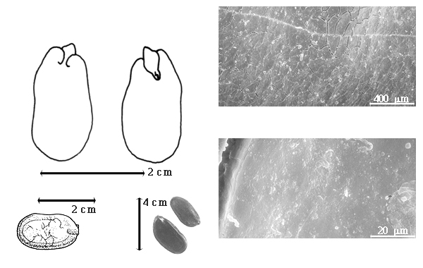 Seed: 14–22 mm long; 8–12 mm wide; 2–4 mm thick; not overgrown; not angular; symmetrical, or asymmetrical; oblong, or irregular (one margin more arched than other); compressed; with surface smooth; without visible radicle and cotyledon lobes; without hilar sinus; without umbo on seed faces; without medial ridge on each face. Cuticle not exfoliating; not inflated; not wrinkled. Testa present; without pieces of adhering epicarp; not adhering to endocarp; free from endocarp; glossy; not modified by a bloom; colored; monochrome; reddish brown; glabrous; smooth, or not smooth; with elevated features, or recessed features; shagreen; obliquely striate; osseous. Pleurogram present (one arm smoothly curved and other irregular especially near hilar end); 90–100 %. Pseudopleurogram absent. Fracture lines present; reticulate (minute but throughout). Rim absent. Wing(s) absent. Raphe not visible. Hilum present; fully concealed; concealed by funicular remnant; without faboid split; larger than punctiform; 0.1–1.5 mm long; with angular outline; irregular (wedged shaped); subapical to radicle tip; flush; not within corona, halo, or rim. Lens not discernible. Endosperm present; thick; not pluglike and not resembling tip of radicle; adnate to embryo. Cotyledons smooth; both outer faces convex; both the same thickness; both more or less of equal length; not folded; margin entire 180 degrees from base of radicle; similar at apex; partially concealing radicle (lower margins); with lobes; with lobes not touching; with the interface division terminating at base of radicle; without margins recessed; inner face flat; glabrous on inner face. Embryonic axis straight; oblique to length of seed; without a joint evident between the radicle and the cotyledons. Radicle differentiated from cotyledon; centered between cotyledons. Plumule moderately developed; glabrous.