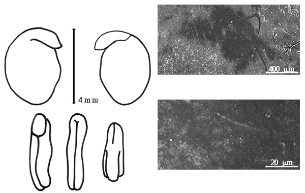 Seed: 6.2 mm long; 5 mm wide; 2.5 mm thick; not overgrown; not angular; asymmetrical; elliptic; compressed; with surface smooth; without visible radicle and cotyledon lobes; without hilar sinus; without umbo on seed faces; without medial ridge on each face. Cuticle not exfoliating; not inflated; not wrinkled. Testa present; without pieces of adhering epicarp; not adhering to endocarp; free from endocarp; dull; not modified by a bloom; colored; mottled; with infrequent mottles; dark brown; with brown overlay (lighter); glabrous; smooth; chartaceous. Pleurogram absent. Pseudopleurogram absent. Fracture lines absent. Rim absent. Wing(s) absent. Raphe not visible. Hilum present; partially concealed; concealed by aril; with faboid split; with the lips of the faboid split the same color as the rest of the hilum; larger than punctiform; 1.5 mm long; with curved outline; elliptic; apical according to radicle tip but marginal according to seed length; recessed; within rim; rim color of testa. Lens discernible; 1 mm long; with margins straight; linear; not in groove of raphe; confluent with hilum; flush; same color as testa; not within corona, halo, or rim. Endosperm absent. Cotyledons not smooth; sulcate; both outer faces convex; both the same thickness; both more or less of equal length; not folded; margin entire 180 degrees from base of radicle; similar at apex; partially concealing radicle; split over radicle; without lobes; with the interface division terminating at base of radicle; without margins recessed; yellow; inner face flat; glabrous on inner face. Embryonic axis oblique; perpendicular to length of seed; without a joint evident between the radicle and the cotyledons. Radicle differentiated from cotyledon; linear; lobe tip curved; deflexed and parallel to cotyledon width; centered between cotyledons; less than 1/2 length of cotyledons. Plumule rudimentary; glabrous.