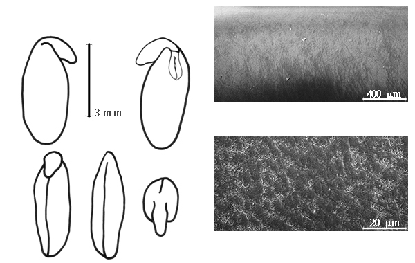 Seed: 5.4–6.7 mm long; 2.5–3 mm wide; 1.1–2.1 mm thick; not overgrown; not angular; asymmetrical; irregularly elliptic; compressed; with surface smooth; without visible radicle and cotyledon lobes; without hilar sinus; without umbo on seed faces; without medial ridge on each face. Cuticle not exfoliating; not inflated; not wrinkled. Testa present; without pieces of adhering epicarp; not adhering to endocarp; free from endocarp; dull; not modified by a bloom; colored; monochrome; dark brown; glabrous; smooth; coriaceous. Pleurogram absent. Pseudopleurogram absent. Fracture lines absent. Rim absent. Wing(s) absent. Raphe visible, or not visible; from hilum to near base of seed and terminating; not bifurcating; darker than testa; black. Hilum present; partially concealed; concealed by aril; with faboid split; with the lips of the faboid split the same color as the rest of the hilum; larger than punctiform; 3.5–4.6 mm long; with straight outline; linear; marginal according to radicle tip; recessed; within rim; rim color of testa, or darker than testa. Lens discernible; with margins straight; linear; not in groove of raphe; confluent with hilum; flush; same color as testa; brown; within rim; rim color of testa, or darker than testa. Endosperm present; trace; not pluglike and not resembling tip of radicle; restricted to region of embryo; adnate to testa. Cotyledons smooth; both outer faces convex; both the same thickness; both more or less of equal length; not folded; margin entire 180 degrees from base of radicle; similar at apex; partially concealing radicle; notched at radicle; without lobes; with the interface division terminating at base of radicle; with margin(s) recessed; with 1 margin recessed; recessed on same side as radicle; yellow; inner face flat; glabrous on inner face. Embryonic axis oblique; oblique to length of seed; without a joint evident between the radicle and the cotyledons. Radicle differentiated from cotyledon; linear; lobe tip curved; oblique to cotyledons; centered between cotyledons; less than 1/2 length of cotyledons. Plumule well developed; glabrous.
