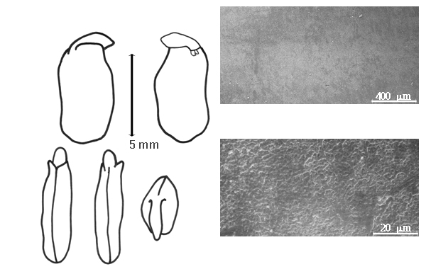 Seed: 4–7 mm long; 2.7–4.5 mm wide; 1.5–3.3 mm thick; not overgrown; not angular; asymmetrical; oblong; terete to compressed; with visible radicle and cotyledon lobes, or without visible radicle and cotyledon lobes; with external groove between radicle and cotyledon lobes; with external groove between radicle and cotyledon lobes same color as testa; without hilar sinus; without umbo on seed faces; without medial ridge on each face. Cuticle not exfoliating; not inflated; not wrinkled. Testa present; without pieces of adhering epicarp; not adhering to endocarp; free from endocarp; dull; modified by a bloom; colored; monochrome; dark reddish brown to tan; glabrous; smooth; coriaceous. Pleurogram absent. Pseudopleurogram absent. Fracture lines absent. Rim absent. Raphe visible; from hilum to near base of seed and terminating; not bifurcating; color of testa; raised to recessed. Hilum present; visible to partially concealed; concealed by funicular remnant; with faboid split; with the lips of the faboid split the same color as the rest of the hilum; punctiform to larger than punctiform; 0.1–0.5 mm long; with curved outline; circular; subapical to radicle tip, or between cotyledon and radicle lobe; recessed; within rim, or not within corona, halo, or rim; rim color of testa. Lens not discernible. Endosperm present; thick to thin; not pluglike and not resembling tip of radicle; covering entire embryo; adnate to testa. Cotyledons smooth; both outer faces convex; both the same thickness; both more or less of equal length; not folded; margin entire 180 degrees from base of radicle; similar at apex; partially concealing radicle; split over radicle; with lobes; with lobes not touching; with the interface division terminating at base of radicle; without margins recessed; yellow, or green (ish); inner face flat; glabrous on inner face. Embryonic axis right angled; perpendicular to length of seed; without a joint evident between the radicle and the cotyledons. Radicle differentiated from cotyledon; linear; lobe tip straight; deflexed and parallel to cotyledon width; centered between cotyledons; less than 1/2 length of cotyledons. Plumule moderately developed to well developed; glabrous.