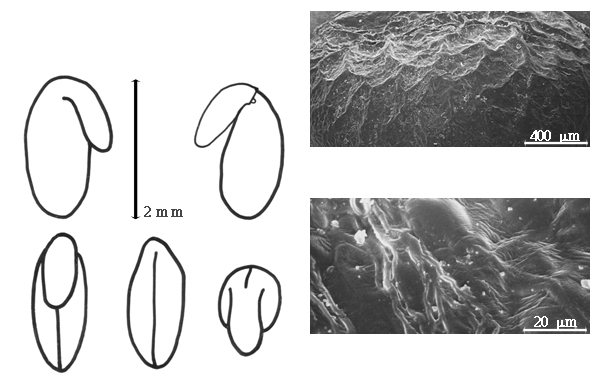 Seed: 1.5 mm long; 1 mm wide; 0.8 mm thick; not overgrown; not angular; symmetrical (except hilum); elliptic; terete; with surface smooth; without visible radicle and cotyledon lobes; without umbo on seed faces; without medial ridge on each face. Cuticle not exfoliating; not inflated; not wrinkled. Testa present; without pieces of adhering epicarp; not adhering to endocarp; free from endocarp; dull; not modified by a bloom; colored; monochrome; brown; glabrous; smooth; coriaceous. Pleurogram absent. Pseudopleurogram absent. Fracture lines absent. Rim absent. Wing(s) absent. Raphe not visible. Hilum present; fully concealed; concealed by funicular remnant; with faboid split; with the lips of the faboid split the same color as the rest of the hilum; punctiform; marginal according to radicle tip; flush; within rim; rim color darker than testa. Lens discernible; with margins straight, or curved; oblong; oblong; not in groove of raphe; adjacent to hilum; 0.1 mm from hilum; mounded; dissimilar color from testa; darker than testa; reddish brown; not within corona, halo, or rim. Endosperm present; thin; not pluglike and not resembling tip of radicle; covering entire embryo; adnate to testa. Cotyledons smooth; both outer faces convex; both the same thickness; both more or less of equal length; not folded; margin entire 180 degrees from base of radicle; similar at apex; not concealing radicle; entire over radicle; without lobes; with the interface division terminating at base of radicle; without margins recessed; yellow; inner face flat; glabrous on inner face. Embryonic axis deflexed; oblique to length of seed; without a joint evident between the radicle and the cotyledons. Radicle differentiated from cotyledon; linear; deflexed and parallel to cotyledon length; centered between cotyledons; less than 1/2 length of cotyledons. Plumule rudimentary; glabrous.