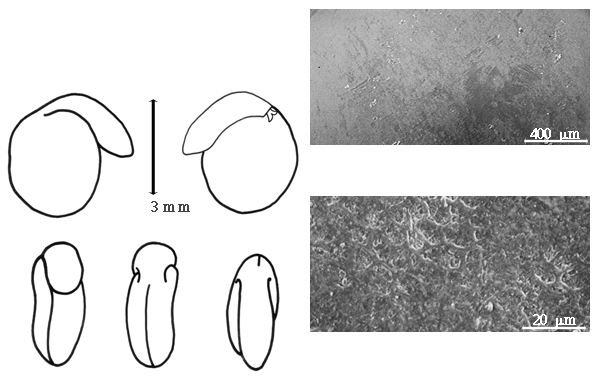 Seed: 2.5–2.7 mm long; 2–2.5 mm wide; 1.7–2 mm thick; not overgrown; angular, or not angular; asymmetrical; oblong, or ovate, or D-shaped; compressed, or terete; with surface smooth; without visible radicle and cotyledon lobes; without hilar sinus; without umbo on seed faces; without medial ridge on each face. Cuticle not exfoliating; not inflated; wrinkled (E. horridum (J.L.M. Vahl) W.H.P. Rothmaler). Testa present; without pieces of adhering epicarp; not adhering to endocarp; free from endocarp; dull; not modified by a bloom; colored; mottled and streaked; with frequent mottles; with frequent streaks; dark reddish brown; with black overlay; glabrous; smooth, or not smooth; with elevated features; wrinkled (because of cuticle); coriaceous. Pleurogram absent. Pseudopleurogram absent. Fracture lines absent. Rim absent. Wing(s) absent. Raphe not visible. Hilum present; visible; with faboid split; with the lips of the faboid split the same color as the rest of the hilum; punctiform; apical at apex of radicle tip; slightly recessed; within rim; rim color of testa. Lens not discernible. Endosperm present; thick; not pluglike and not resembling tip of radicle; covering entire embryo; adnate to testa. Cotyledons smooth; both outer faces convex; both the same thickness; both more or less of equal length; not folded; margin entire 180 degrees from base of radicle; similar at apex; not concealing radicle; split over radicle; with lobes; with the interface division terminating at base of radicle; without margins recessed; reddish tan; inner face flat; glabrous on inner face. Embryonic axis deflexed; oblique to length of seed; without a joint evident between the radicle and the cotyledons. Radicle differentiated from cotyledon; somewhat linear; lobe tip straight; deflexed and parallel to cotyledon length; centered between cotyledons; 1/2 to nearly length of cotyledons. Plumule moderately developed; glabrous.