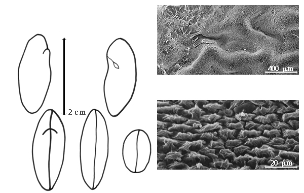 Seed: 20–45 mm long; 10–20 mm wide; 10–20 mm thick; not overgrown; angular; symmetrical; mitaform to irregular; terete; with surface smooth; without visible radicle and cotyledon lobes; without hilar sinus; without umbo on seed faces; without medial ridge on each face. Cuticle not exfoliating; not inflated; not wrinkled. Testa present; without pieces of adhering epicarp; not adhering to endocarp; free from endocarp; dull; not modified by a bloom; colored; monochrome, or mottled; with infrequent mottles; brown, or red (dark); with black overlay; glabrous; not smooth; with elevated features; rugose; coriaceous. Pleurogram absent. Pseudopleurogram absent. Fracture lines absent. Rim absent. Wing(s) absent. Raphe visible; from hilum to near base of seed and terminating; not bifurcating; color of testa; raised. Hilum present; fully concealed; concealed by funicular remnant; without faboid split; larger than punctiform; 2–5 mm long; with curved outline; elliptic to fusiform; apical according to radicle tip but marginal according to seed length; recessed; within rim; rim color darker than testa. Lens not discernible. Endosperm absent. Cotyledons not smooth; finely rugose; both outer faces convex; both the same thickness; both more or less of equal length; not folded; margin not entire 180 degrees from base of radicle; notched; similar at apex; completely concealing radicle; notched at radicle; without lobes; with the interface division terminating at base of radicle; without margins recessed; green to tan; inner face wrinkled; glabrous on inner face. Embryonic axis oblique; oblique to length of seed; without a joint evident between the radicle and the cotyledons. Radicle not differentiated from cotyledon; bulbose; lobe tip straight; oblique to cotyledons; centered between cotyledons; less than 1/2 length of cotyledons. Plumule rudimentary; glabrous.