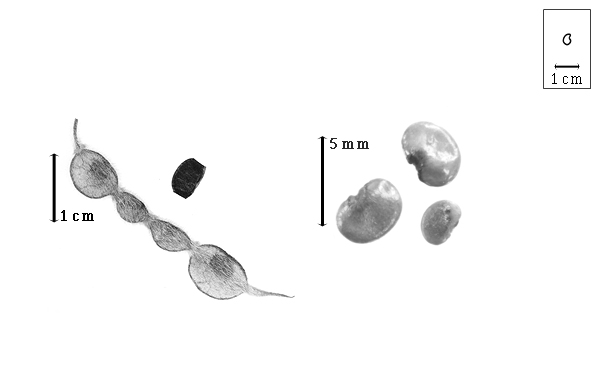 Fruit: A loment (or a loment segment); 3.3–4 cm long; 0.3–0.7 cm wide; 0.7–0.9 cm thick; 2–9 times longer than wide; with deciduous androecial sheath; with deciduous corolla; with persistent calyx; with calyx shorter than fruit; without orifice formed by curving of fruit or fruit segments; slightly curved, or straight; not plicate; not twisted; asymmetrical; moniliform; with 1 straight and 1 curved suture, or both sutures parallelly curved; narrowing in several places, resembling Desmodium (3.11.09) fruit; not inflated; flattened; with beak; declined; with solid beak the same color and texture as fruit; rounded at apex; aligned with longitudinal axis of fruit, or oblique with longitudinal axis of fruit; rounded at base; aligned with longitudinal axis of fruit, or oblique with longitudinal axis of fruit; with the apex and base uniform in texture; coriaceous; seed chambers externally visible; seed chambers with the raised seed chambers not torulose; margin constricted; margin constricted along both margins, or slightly constricted along both margins; margin without sulcus; margin plain; wing(s) absent; stipitate, or substipitate; with the stipe 5–70 mm long; indehiscent. Replum invisible. Loment indehiscent; segments (articles) inconspicuous; segments (articles) 5–13 mm long; segments (articles) widest across seed area; segments (articles) with apical 1 different shape than middle one(s), or basal 1 different shape than middle one(s); segments (articles) D-shaped, or circular. Epicarp dull; monochrome; dark reddish to light brown, or tan; with surface texture uniform; pubescent and indurate; with hairs erect; with 1 type of pubescence; sericeous; with pubescence gray; with pubescence uniformly distributed; with simple hairs; pliable; with hair bases plain; eglandular; without spines; not smooth; with elevated features; veined, or not veined; reticulately veined; not tuberculate; not exfoliating; without cracks; without embedded tissue, much thicker than epicarp, running from base to apex. Mesocarp present; thin; surface not veined; 1-layered; without balsamic vesicles; without fibers; without reniform canals; solid; coriaceous. Endocarp present; visible; dull; opaque; monochrome; reddish brown; smooth; without adhering pieces of testa; septate; with septa thicker than paper, firm; with septa eglandular; chartaceous; not exfoliating; remaining fused to mesocarp and epicarp; without wings; entire. Seed(s) 1–5; length parallel with fruit length; neither overlapping nor touching; in 1 series. Funiculus 0.5–1 mm long; of 1 length only; flattened; straight. Aril absent.