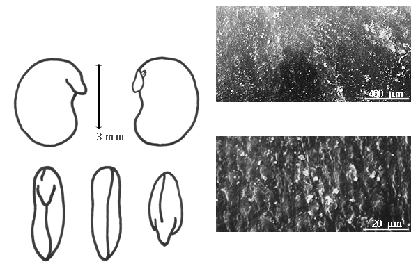 Seed: 2.5–4.5 mm long; 2.5–3 mm wide; 1.3–1.5 mm thick; not overgrown; not angular; asymmetrical; reniform, or oblong; flattened; with surface smooth; with visible radicle and cotyledon lobes, or without visible radicle and cotyledon lobes; without external groove between radicle and cotyledon lobes; without hilar sinus; without umbo on seed faces; without medial ridge on each face. Cuticle not exfoliating; not inflated; not wrinkled. Testa present; without pieces of adhering epicarp; not adhering to endocarp; free from endocarp; glossy; not modified by a bloom; colored; monochrome (but note hilar halo); dark reddish brown; glabrous; smooth; coriaceous. Pleurogram absent. Pseudopleurogram absent. Fracture lines absent. Rim absent. Wing(s) absent. Raphe not visible. Hilum present; visible; with faboid split; with the lips of the faboid split the same color as the rest of the hilum; larger than punctiform; 0.5 mm long; with curved outline; elliptic; marginal according to radicle tip, or between cotyledon and radicle lobe; flush; within halo; halo darker than testa (and irregular in outline). Lens discernible; 0.3–0.8 mm long; with margins straight, or curved; irregular, or linear, or wedge-shaped; irregular; not in groove of raphe; confluent with hilum; mounded, or recessed; dissimilar color from testa; darker than testa; dark reddish brown; not within corona, halo, or rim. Endosperm present; thin; not pluglike and not resembling tip of radicle; covering entire embryo; adnate to testa. Cotyledons smooth; both outer faces convex; both the same thickness; both more or less of equal length; not folded; margin entire 180 degrees from base of radicle; similar at apex; not concealing radicle; entire over radicle; without lobes; with the interface division terminating at base of radicle; without margins recessed; tan; inner face flat; glabrous on inner face. Embryonic axis deflexed; oblique to length of seed; without a joint evident between the radicle and the cotyledons. Radicle differentiated from cotyledon; linear; deflexed and parallel to cotyledon length; centered between cotyledons; less than 1/2 length of cotyledons. Plumule moderately developed; glabrous.